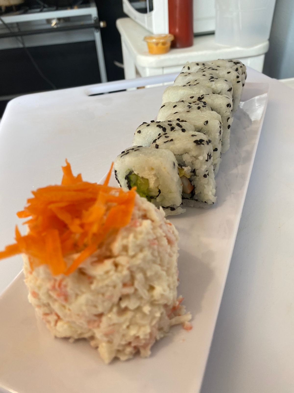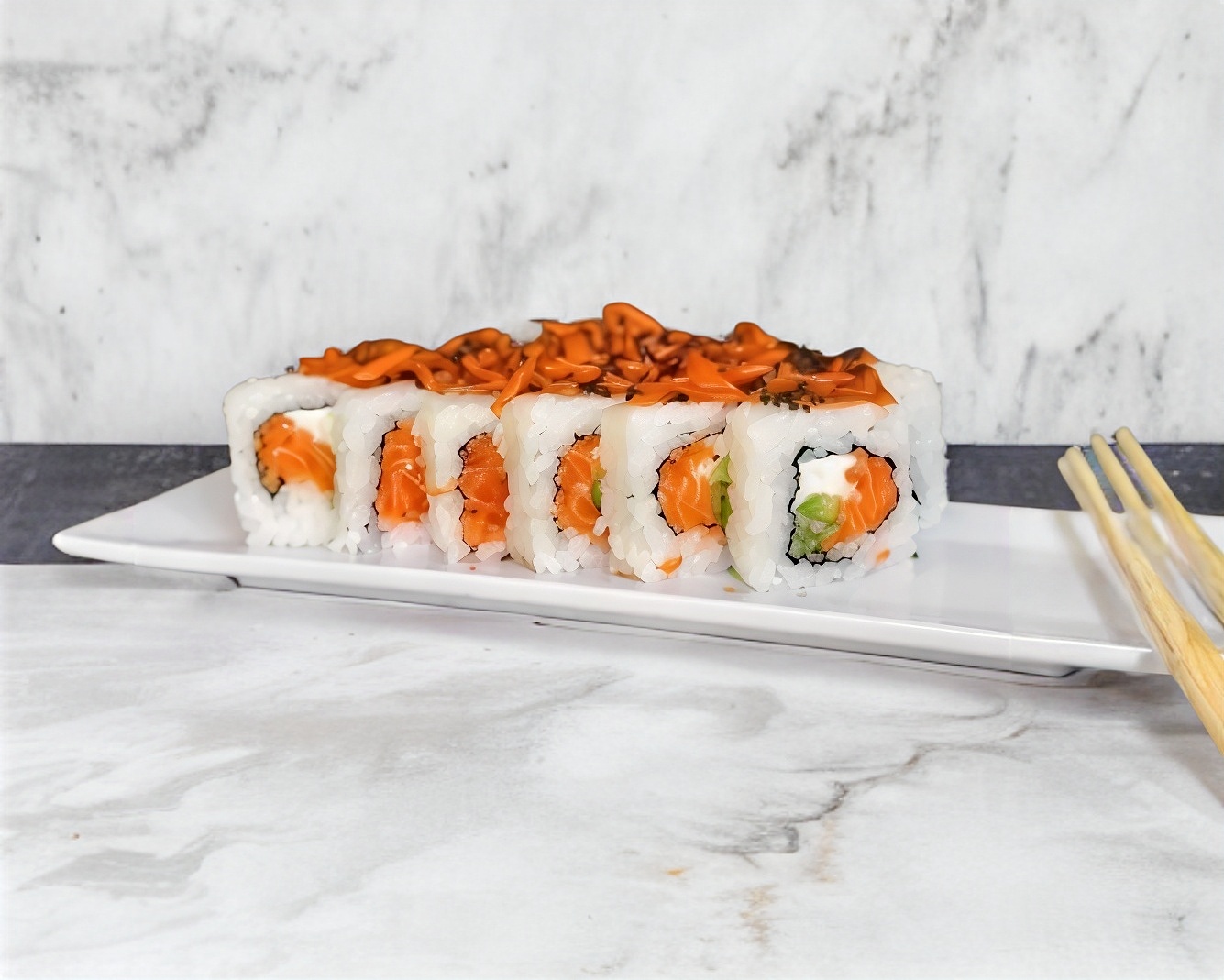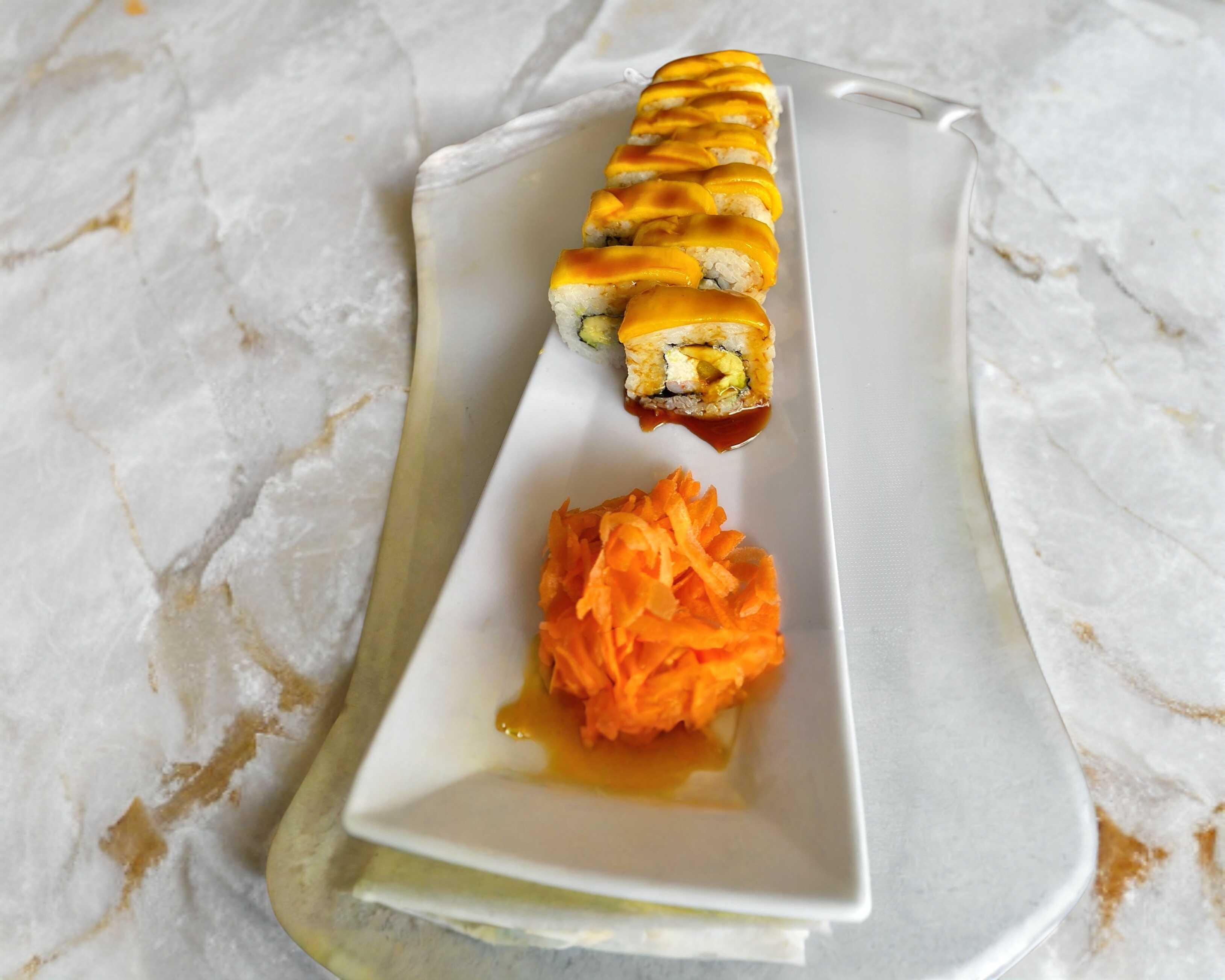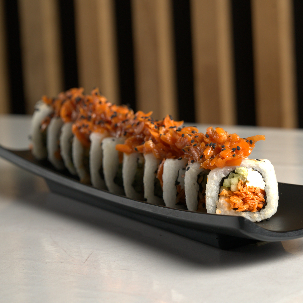 Pd zanahoria; pf topping de zanahoria con aderezo secreto spicy y decorado con ajonjolí todos los rollos incluyen philadelphia, aguacate y pepino por dentro todos los rollos incluyen philadelphia, aguacate y pepino por dentro.