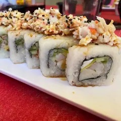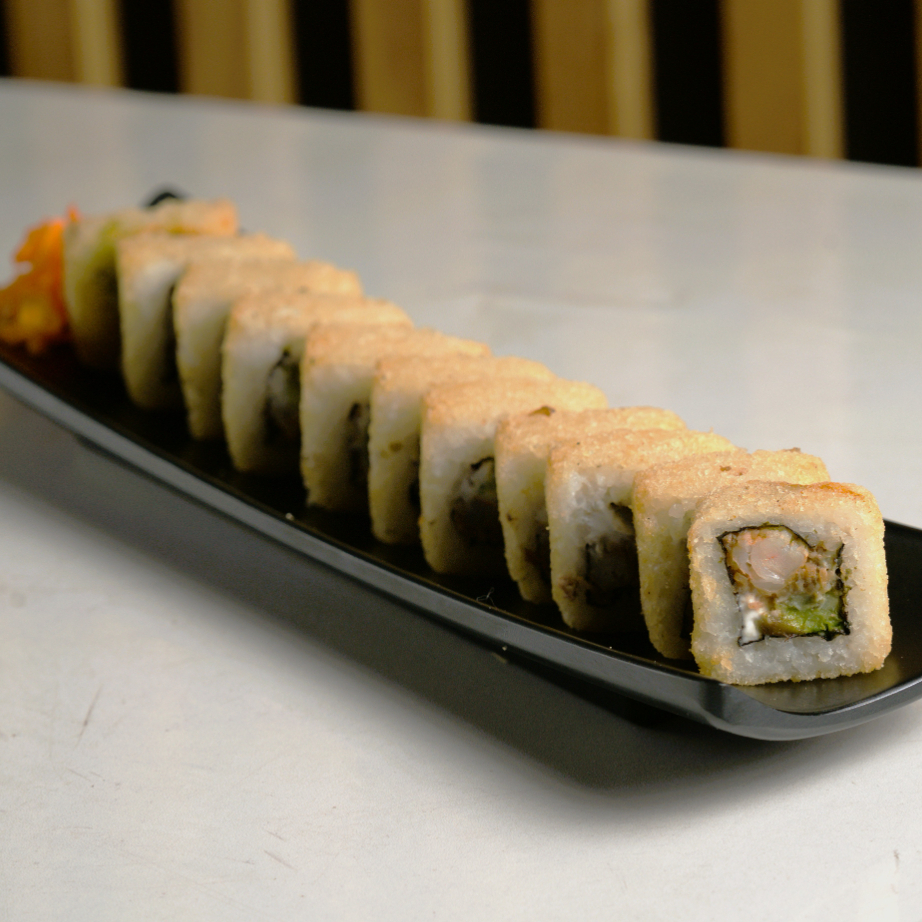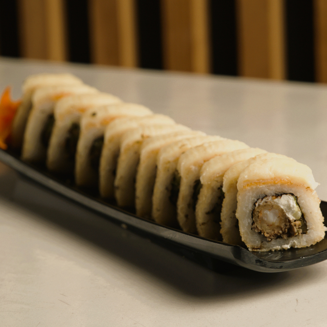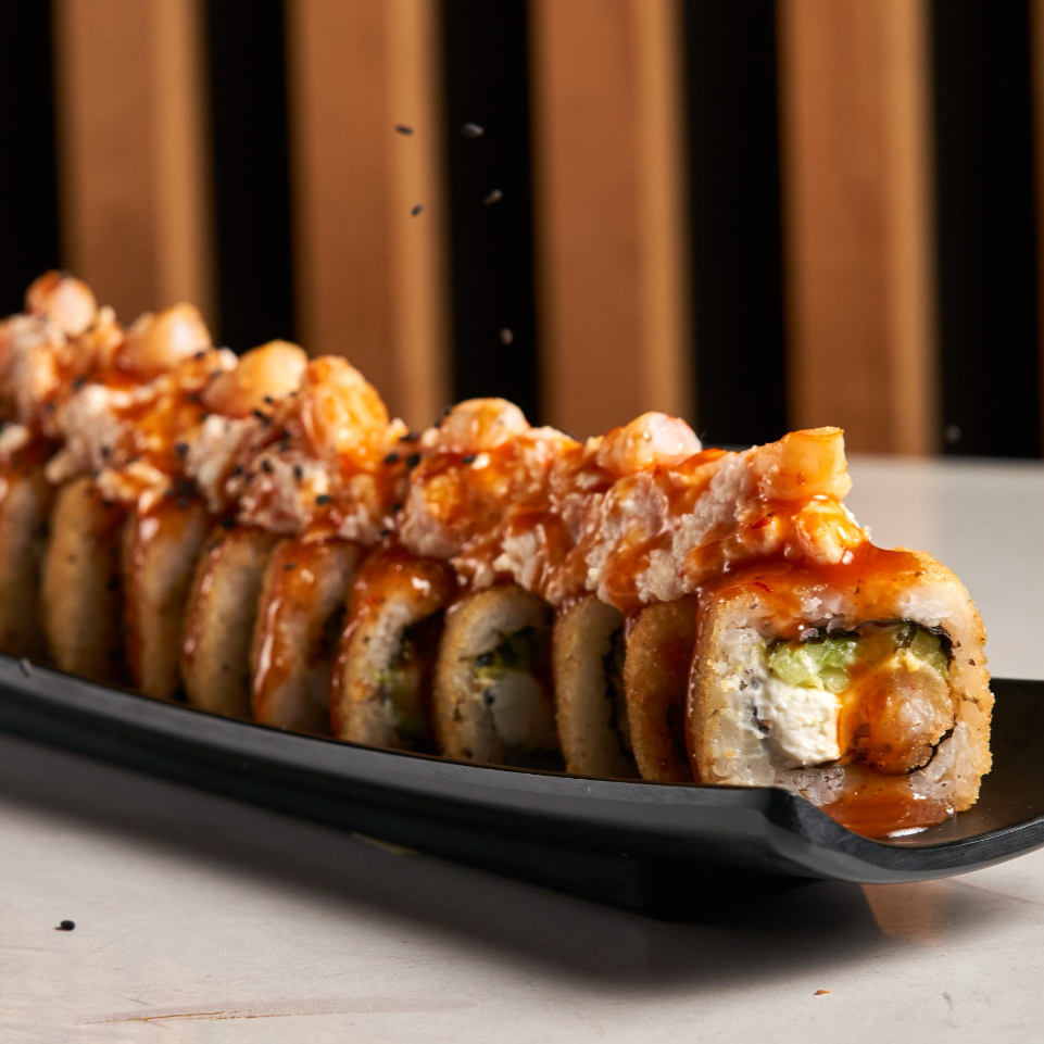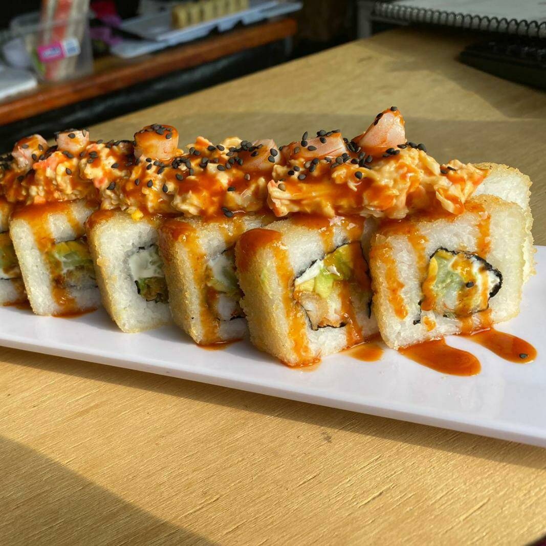 Pd:camarón, philadelphia, aguacate, pepino; pf: topping de tampico tasty, camarón empanizado y siracha.
