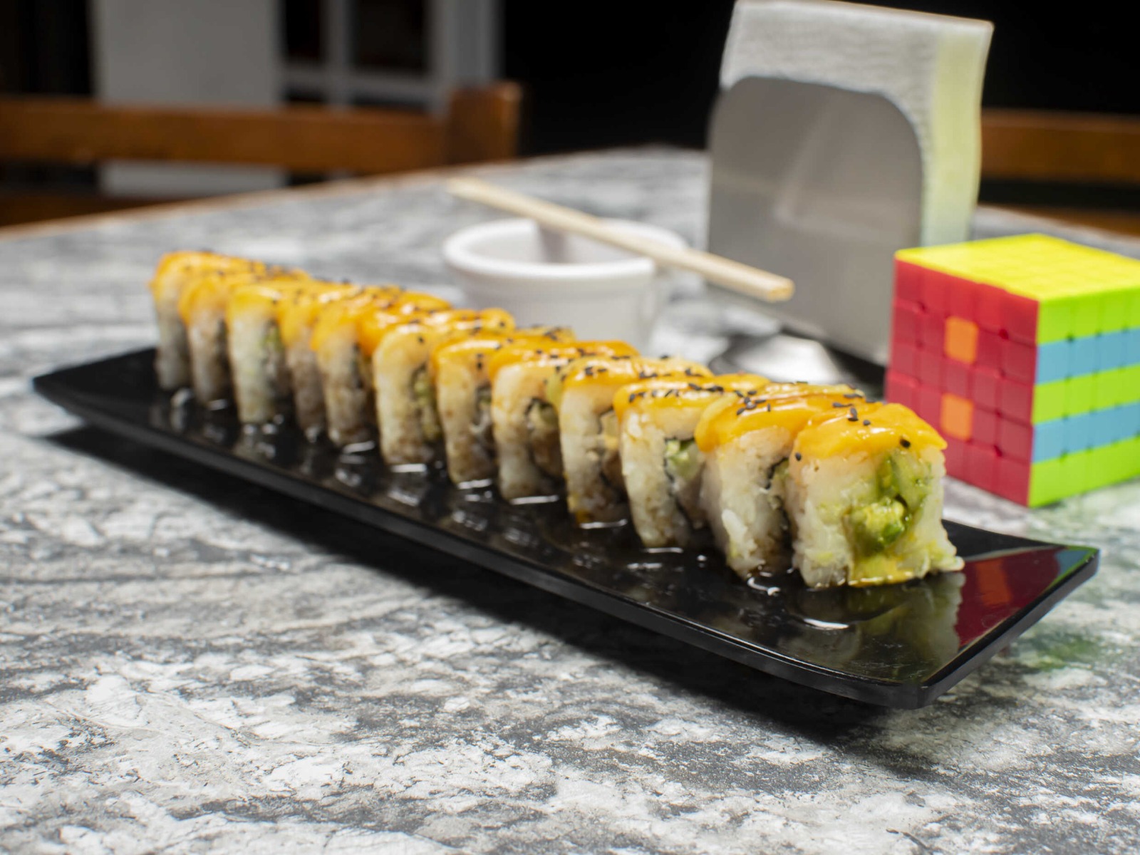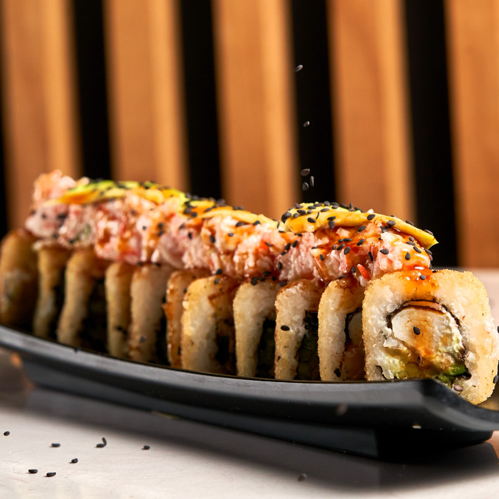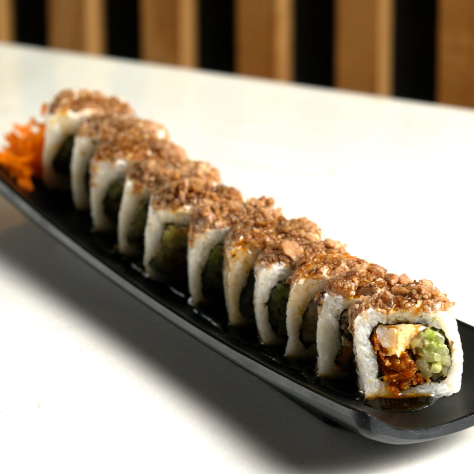 Nuestra especialidad: tapa de arroz empanizada con philadephia, camarón, res, trozos de tocino, aguacate, gratinado con queso mozzarella, coronada con topping de tampico, bañada en chipotley salsa de anguila con un toque de ajonjolí negro.