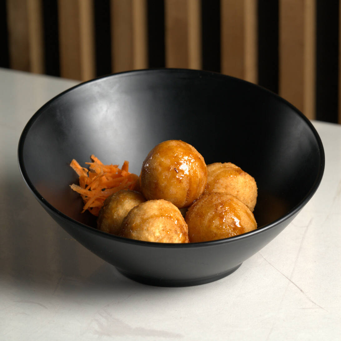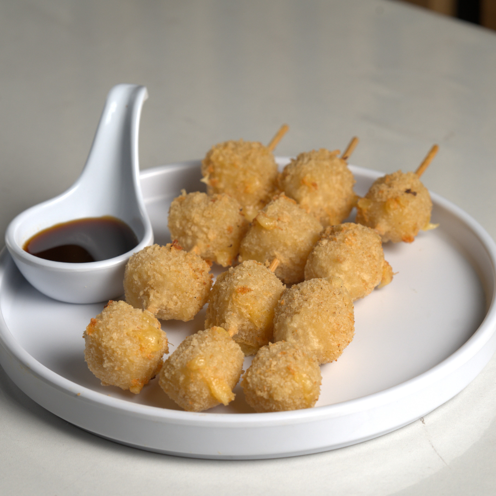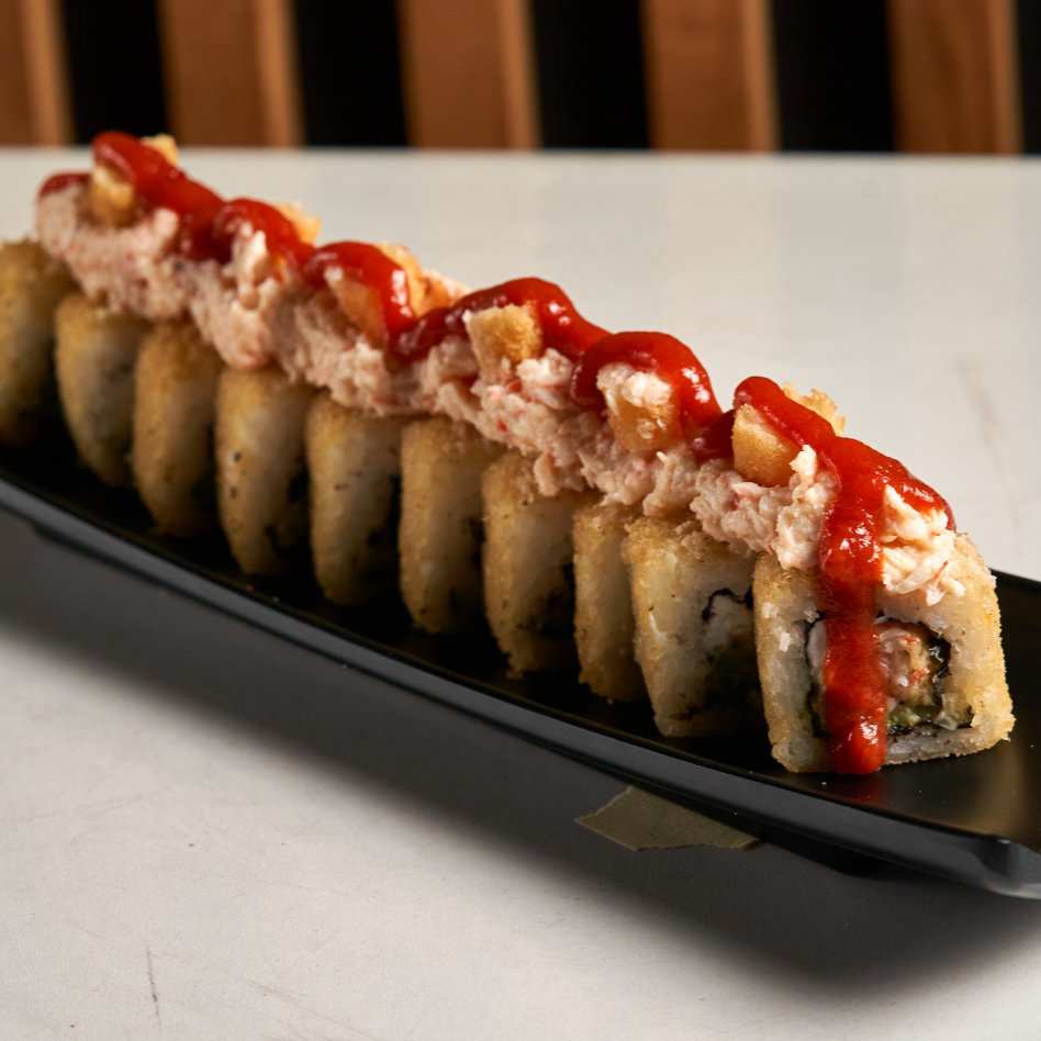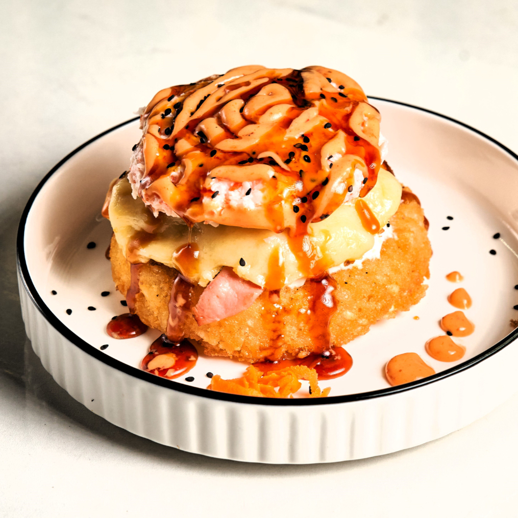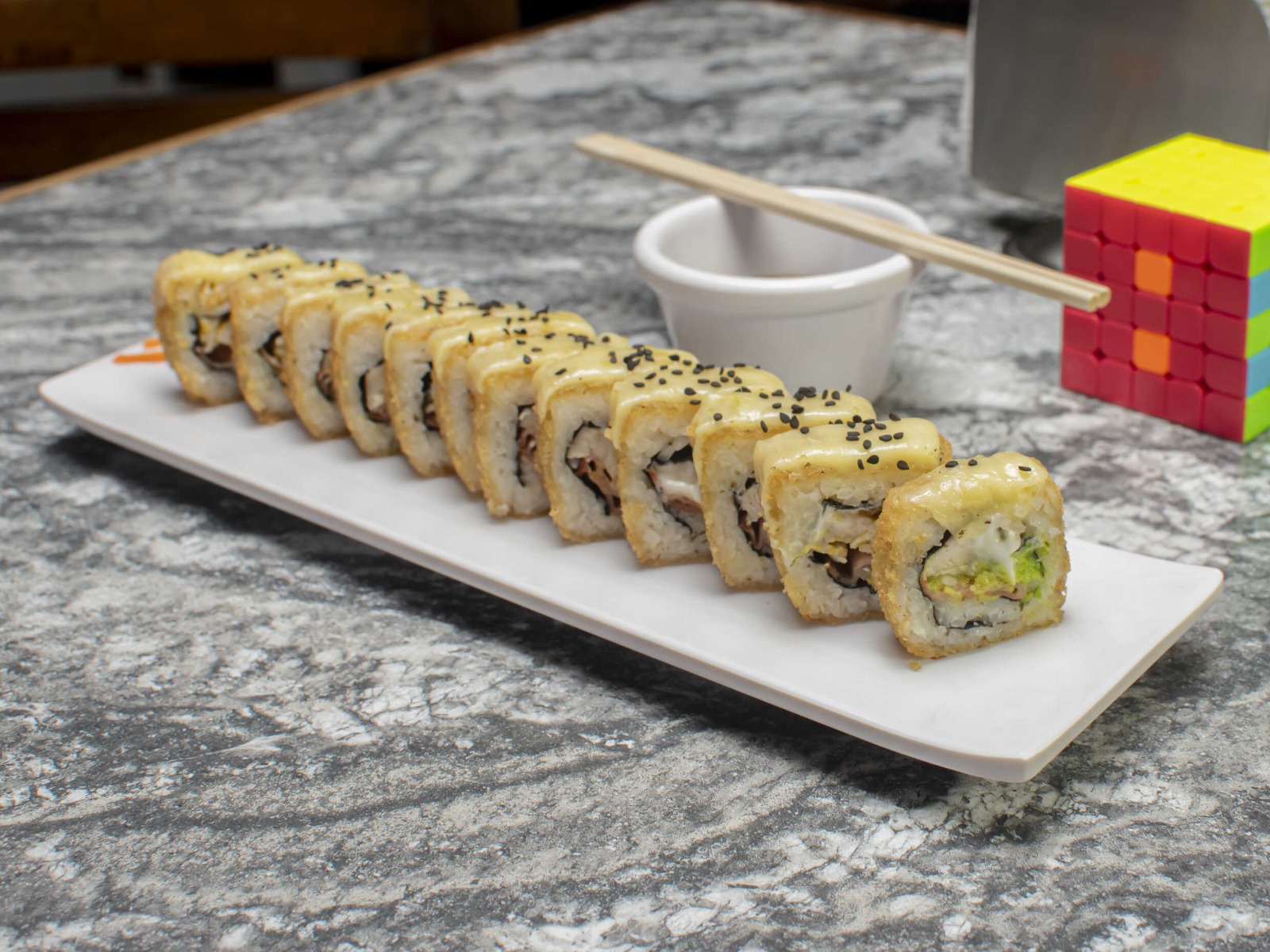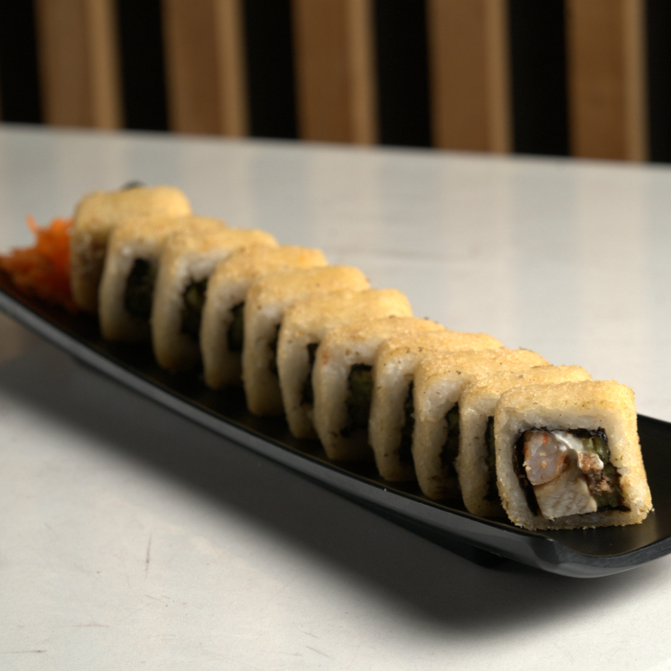 Bola de arroz al vapor empanizado, relleno de queso philadelphia, mozzarella, tampico, chile serrano, proteína a elegir, bañada en salsa de anguila y aderezo secreto spicy, gratinada con queso mozzarella al horno.