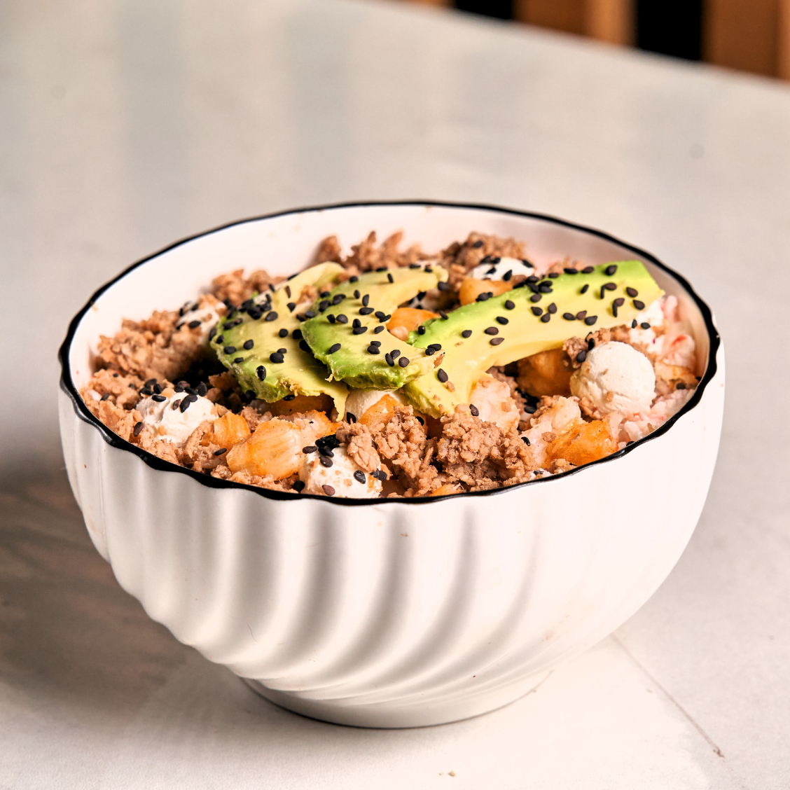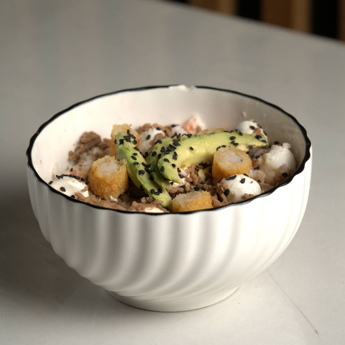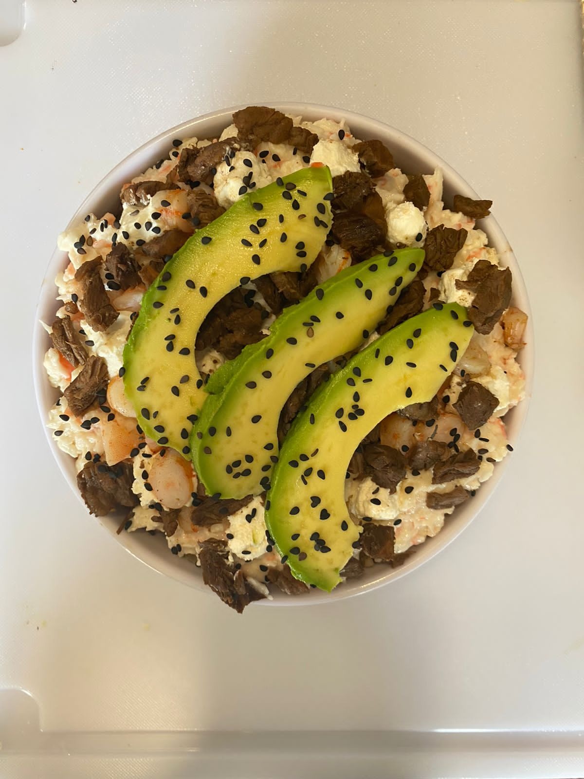 Arroz blanco al vapor, acompañado de tampico, philadephia, res, camarón empanizado, aguacate y decorado con ajonjolí.