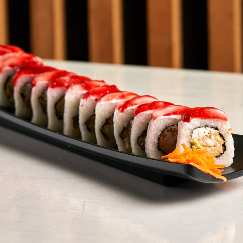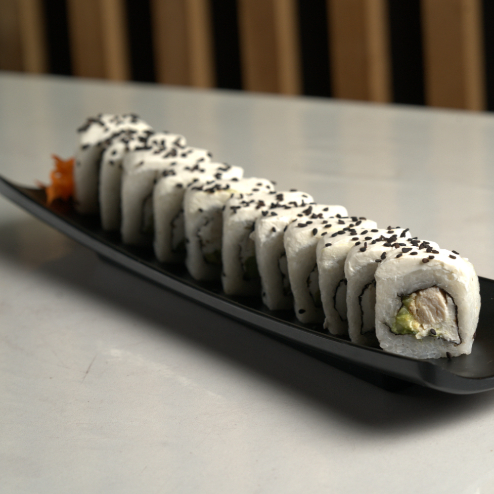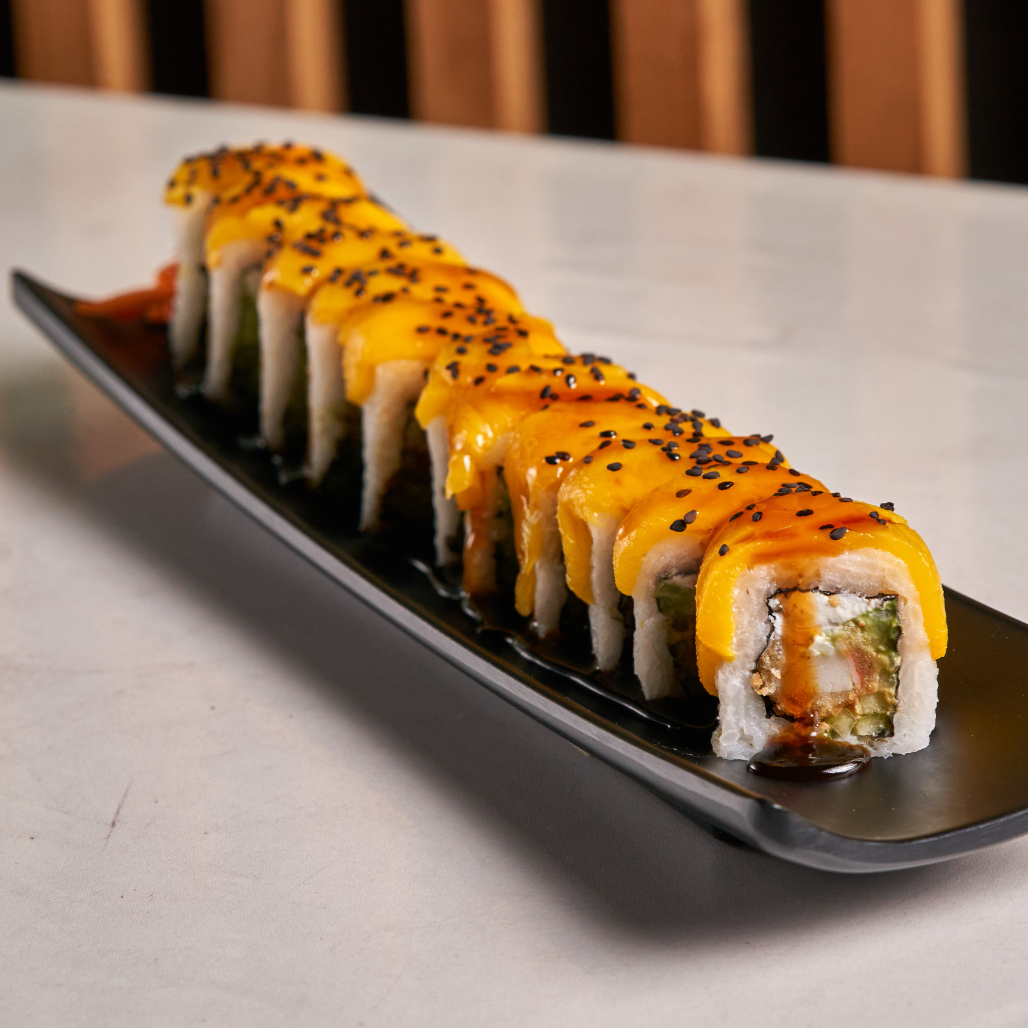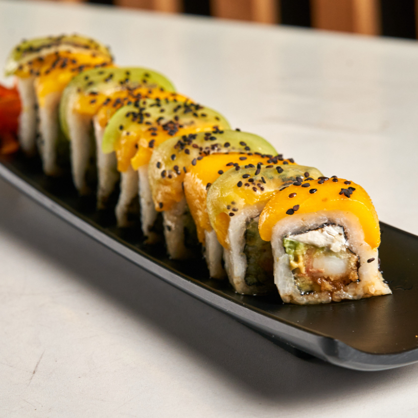 Pd camarón empanizado; pfdurazno, kiwi, mango, bañado en salsa de anguila y ajonjolí negro todos los rollos incluyen philadelphia, aguacate y pepino por dentro todos los rollos incluyen philadelphia, aguacate y pepino por dentro.