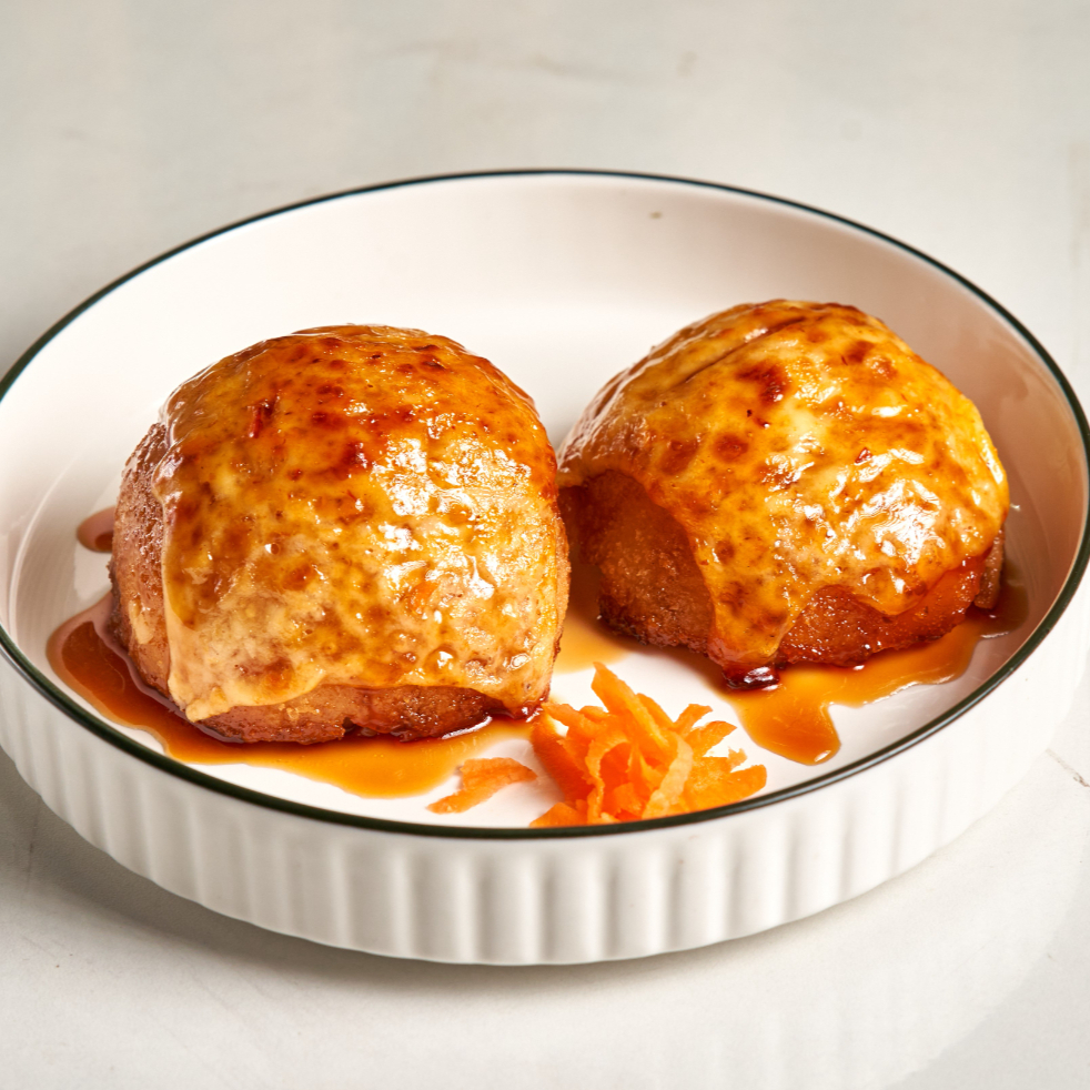 2 Pequeñas bolas de arroz al vapor con philadelphia, tampico, queso mozzarella e ingrediente opcional a elegir, bañado en salsa de anguila.