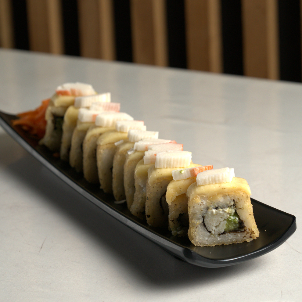 Pd: camarón, philadelphia, aguacate, pepino, cangrejo; pf: gratinado con queso mozzarella y trocitos de cangrejo.