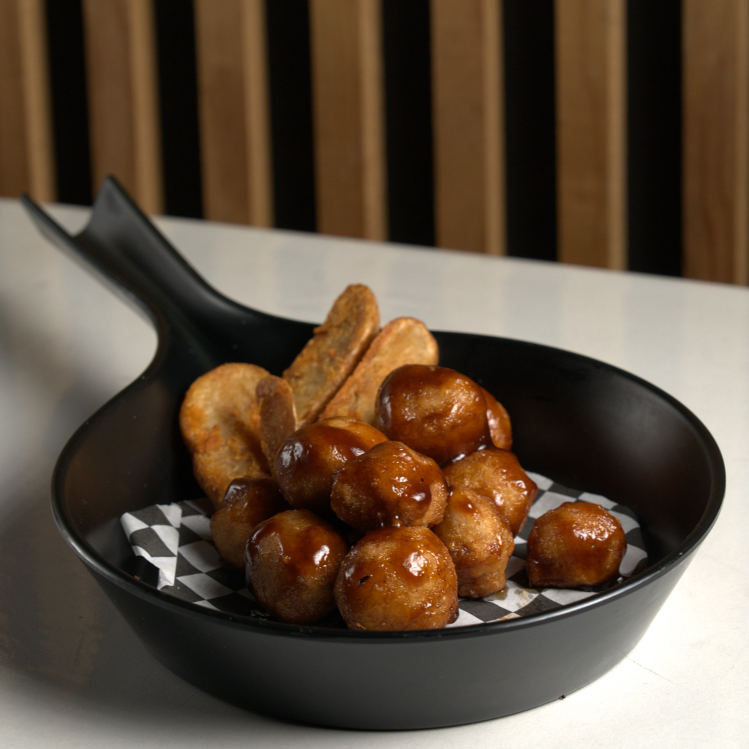 6 Pequeñas bolas de arroz al vapor con philadelphia, tampico, queso mozzarella e ingrediente opcional a elegir, bañado en salsa de anguila.