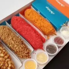 Banderilla cubierta de fideos ramen súper crujientes, rellénala a tu gusto: salchicha, queso manchego derretido o combinada, dale tu toque eligiendo 2 salsas de nuestras 14 opciones exclusivas, pro tip, mejora la experiencia agregando tu refresco favorito aquí mismo.