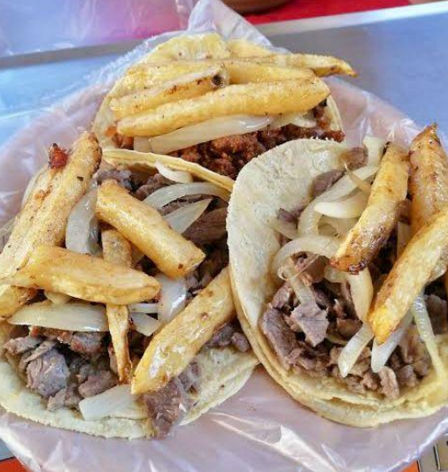 Taco de bistec con doble tortilla acompañado de papas y cebolla.