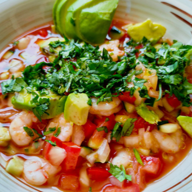 Sustancioso y reconfortante caldo de camarón con verduras y el sazón tradicional de la casa.