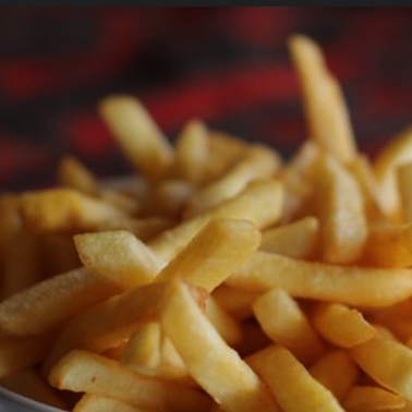 Porción individual de papas fritas, doradas y crujientes por fuera.