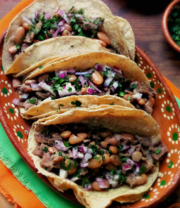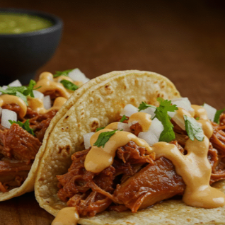 Tortilla de maíz acompañada de guacamole, pico de gallo y exquisitas carnitas de marlín sazonadas.