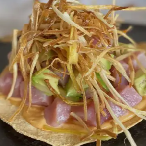 Tostada con una mezcla perfecta de mango, cebolla, salsa negra y guacamole; elige tu proteína de atún fresco.