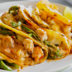 Deliciosa tortilla de maíz rellena de queso fundido, camarón perfectamente sazonado, cebolla y un toque de pimiento rojo.