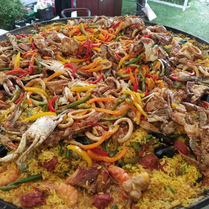 paella mixta, mariscos ( jaiba, almeja, camaron, calamar, mejillon) y carne (pollo y chorizo español)