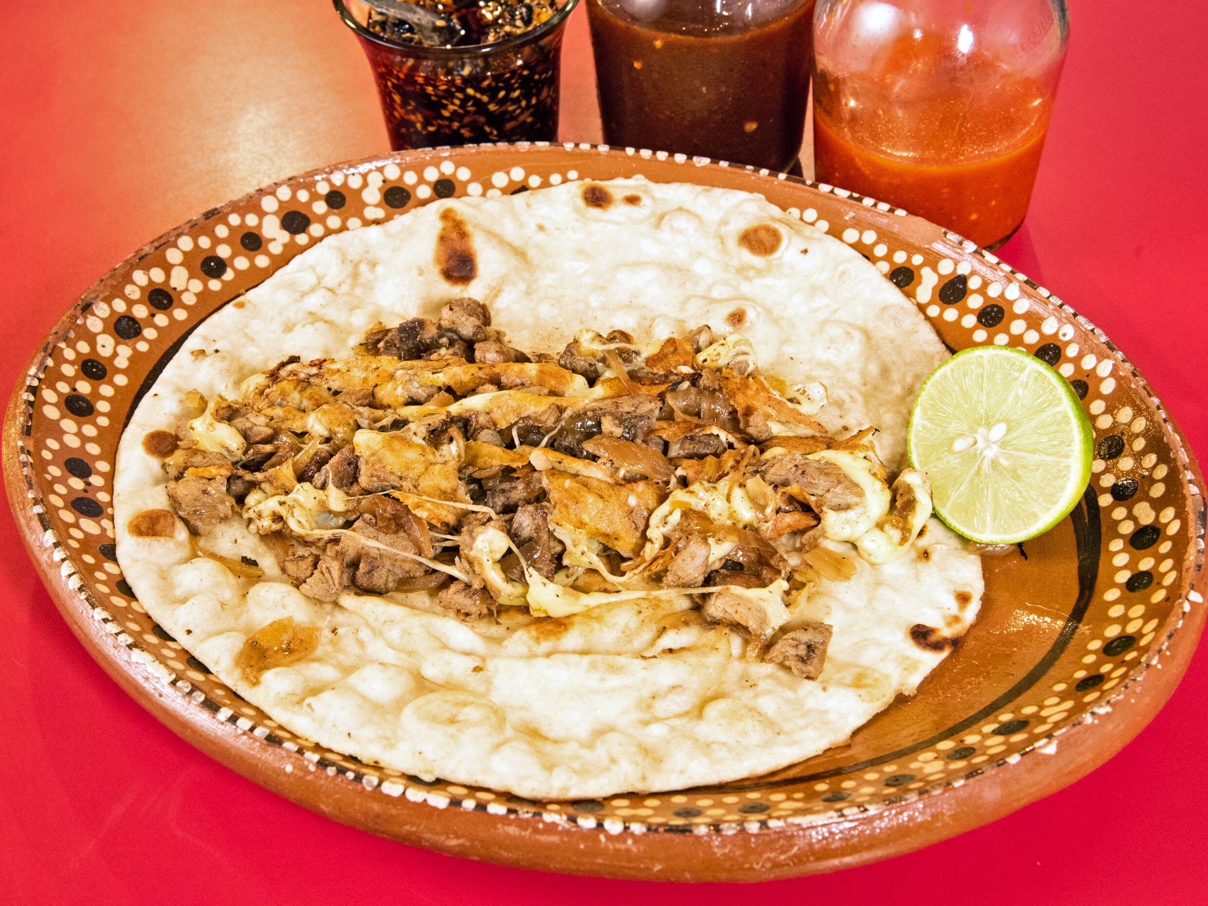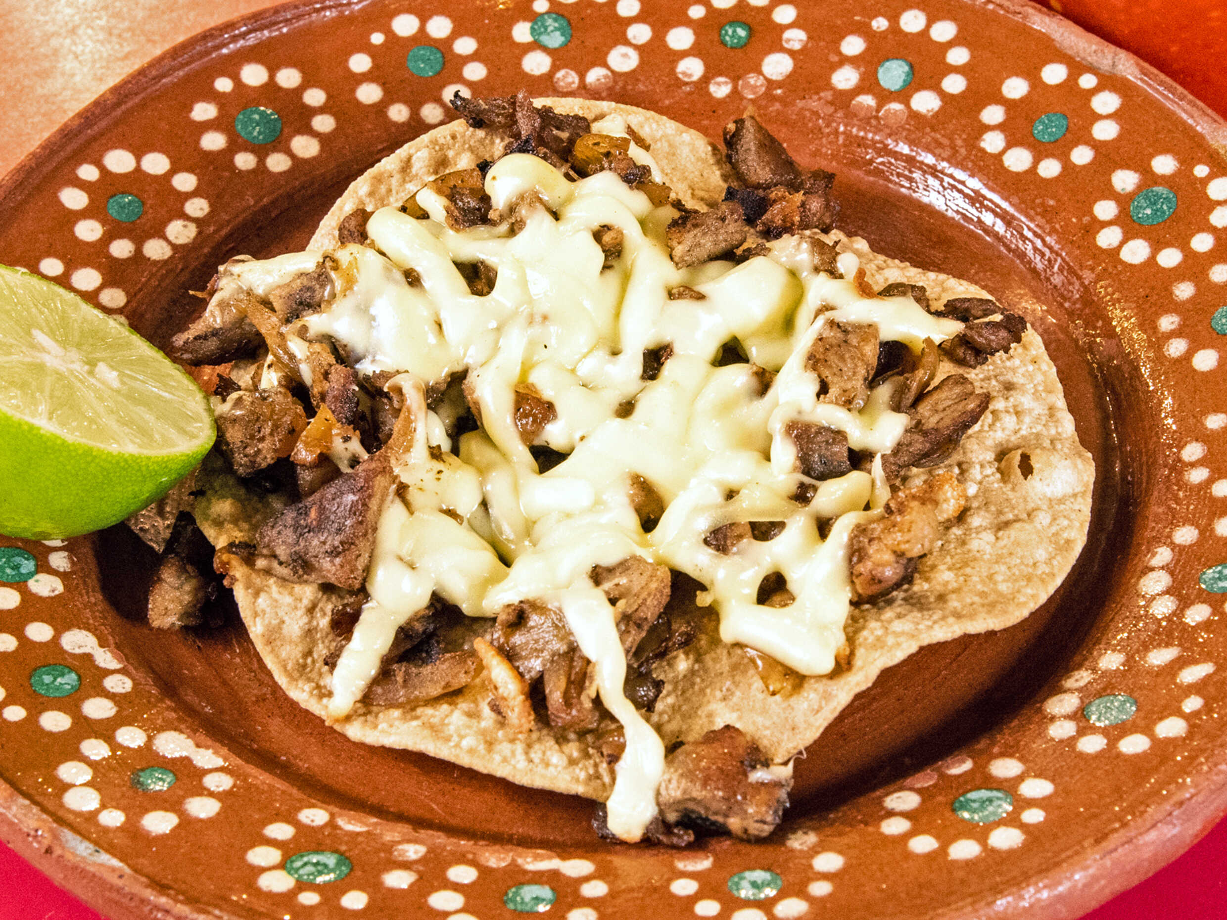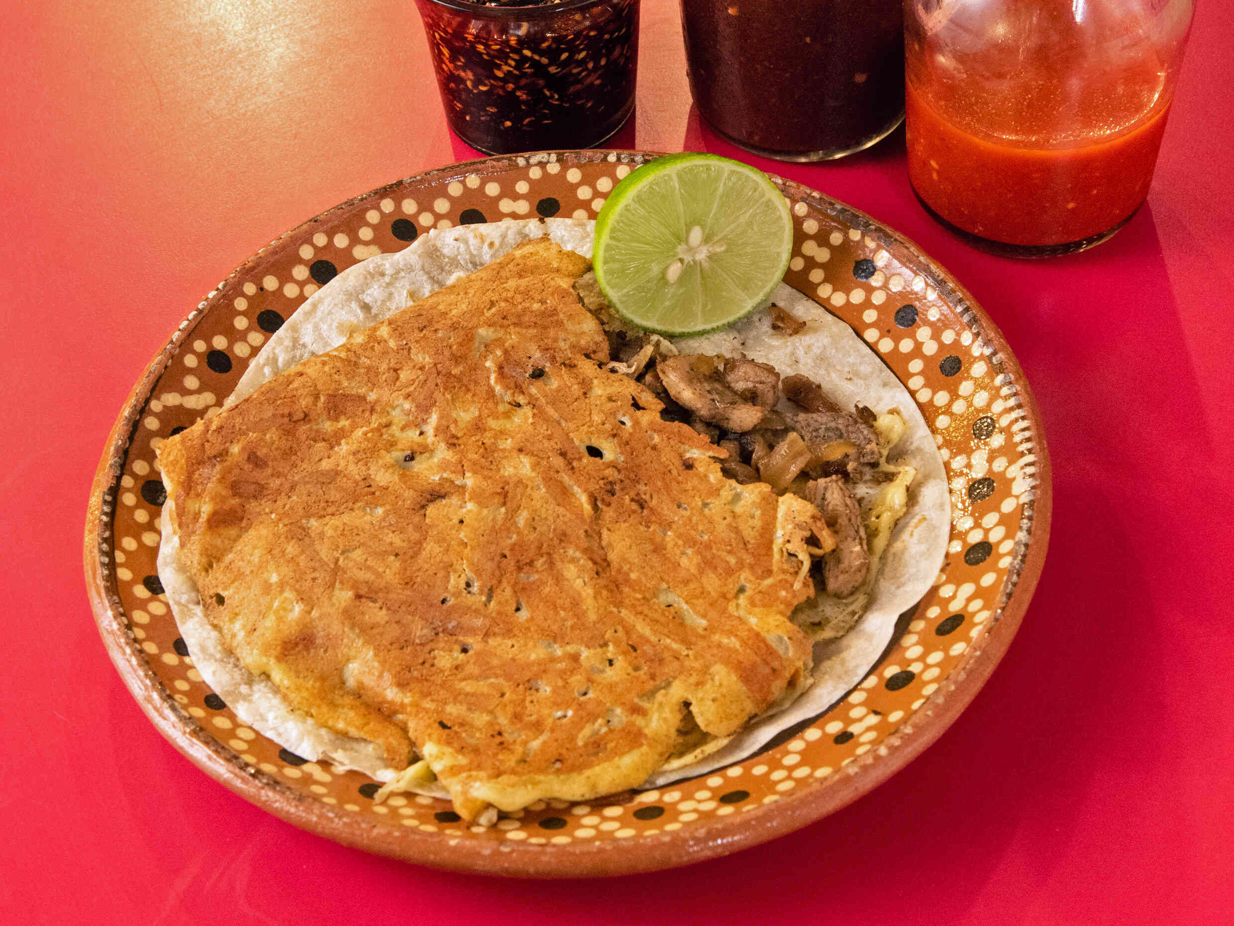 Dos tortillas de harina con carne de tu elección con costra de queso, uno de los favoritos