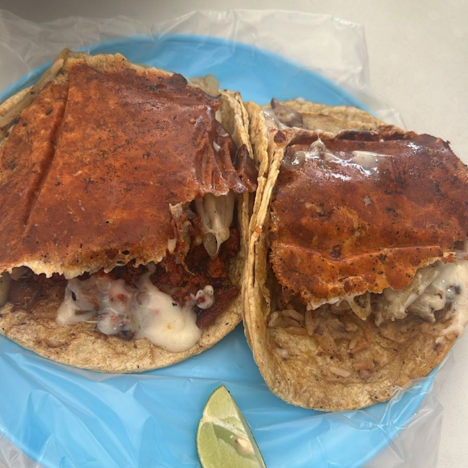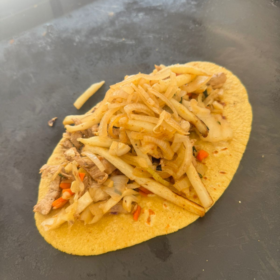 Es un taco gigante sobre una tortilla hecha a mano rellena de queso