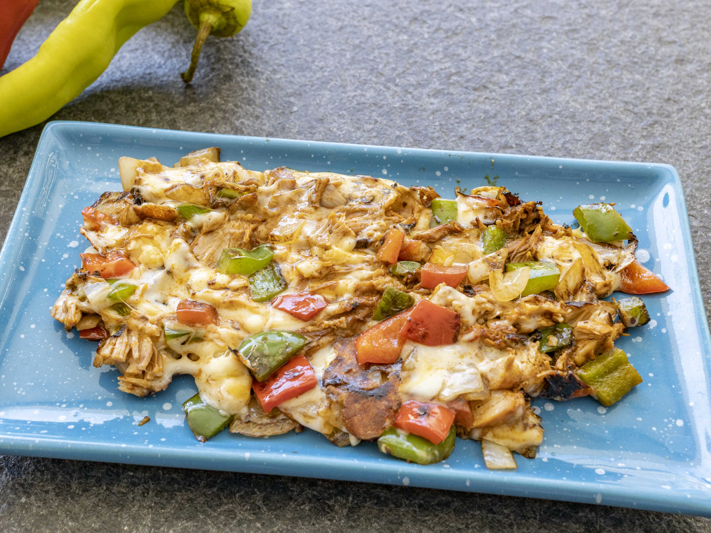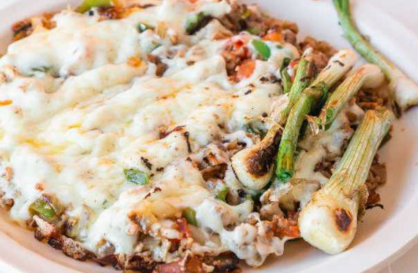 Carne de tu elección, cebolla, pimiento morrón de dos colores, tocino, queso gratinado y tortillas 250gr