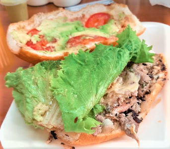Telera tradicional con 150 gr carne, una costra de queso, jitomate, aguacate, cebolla, lechuga y fijolitos (incluye verdura y salsas)