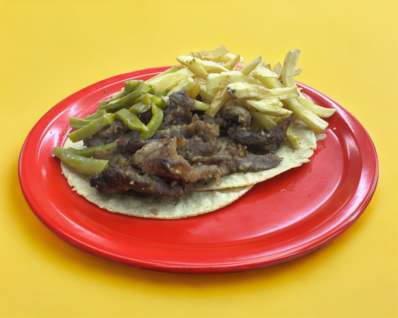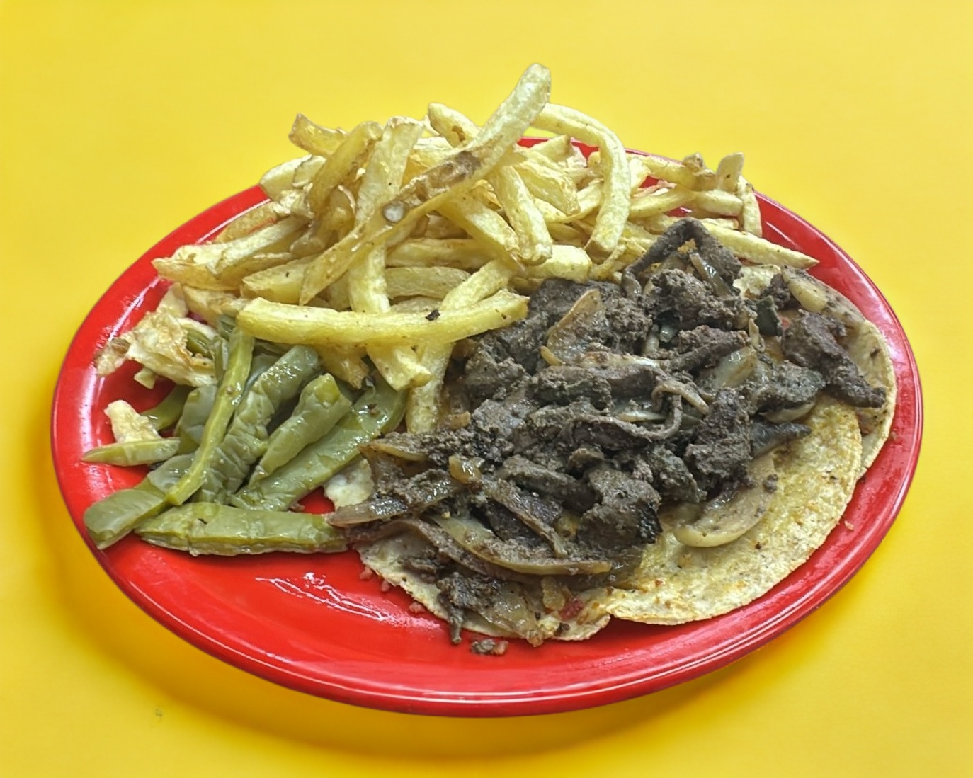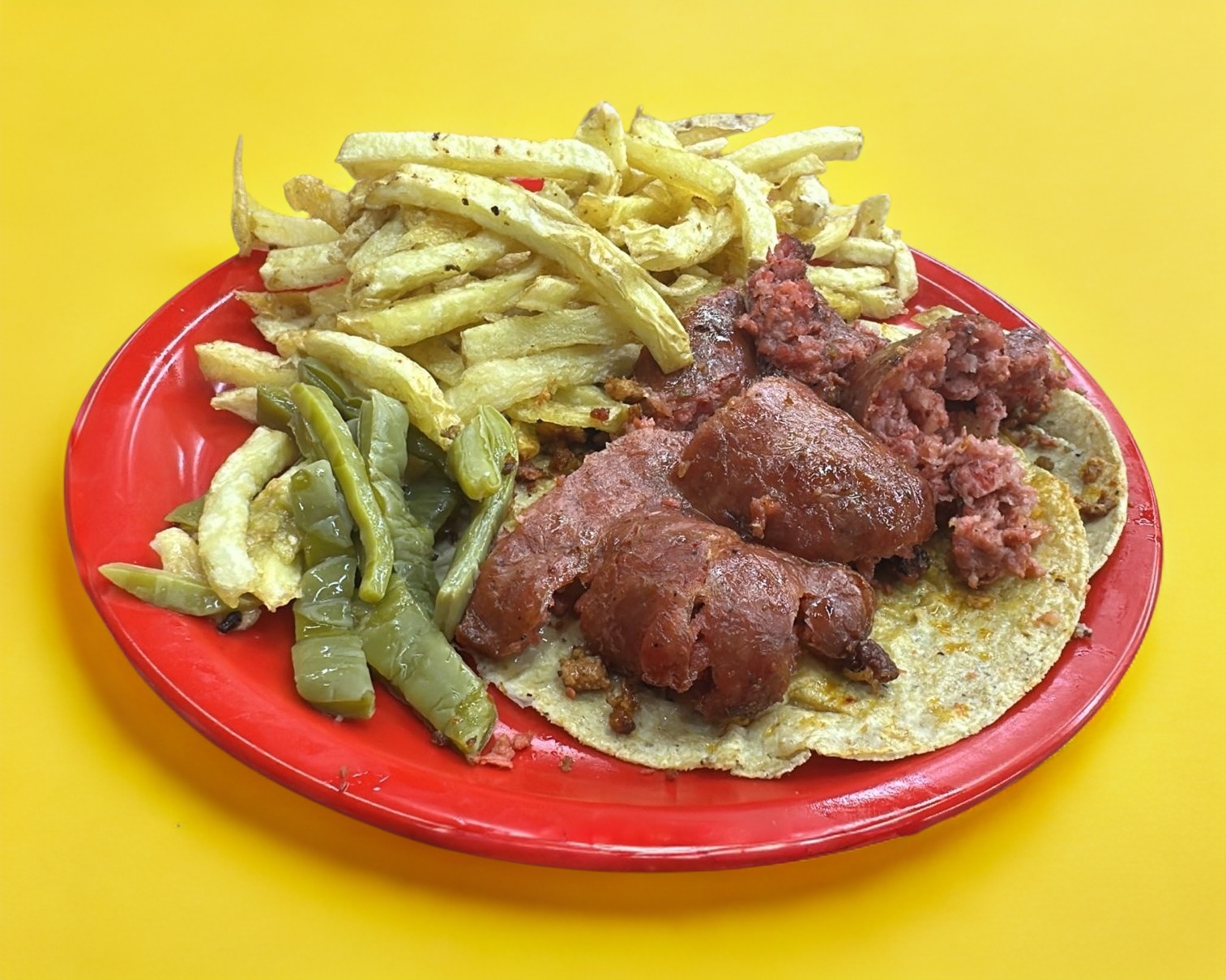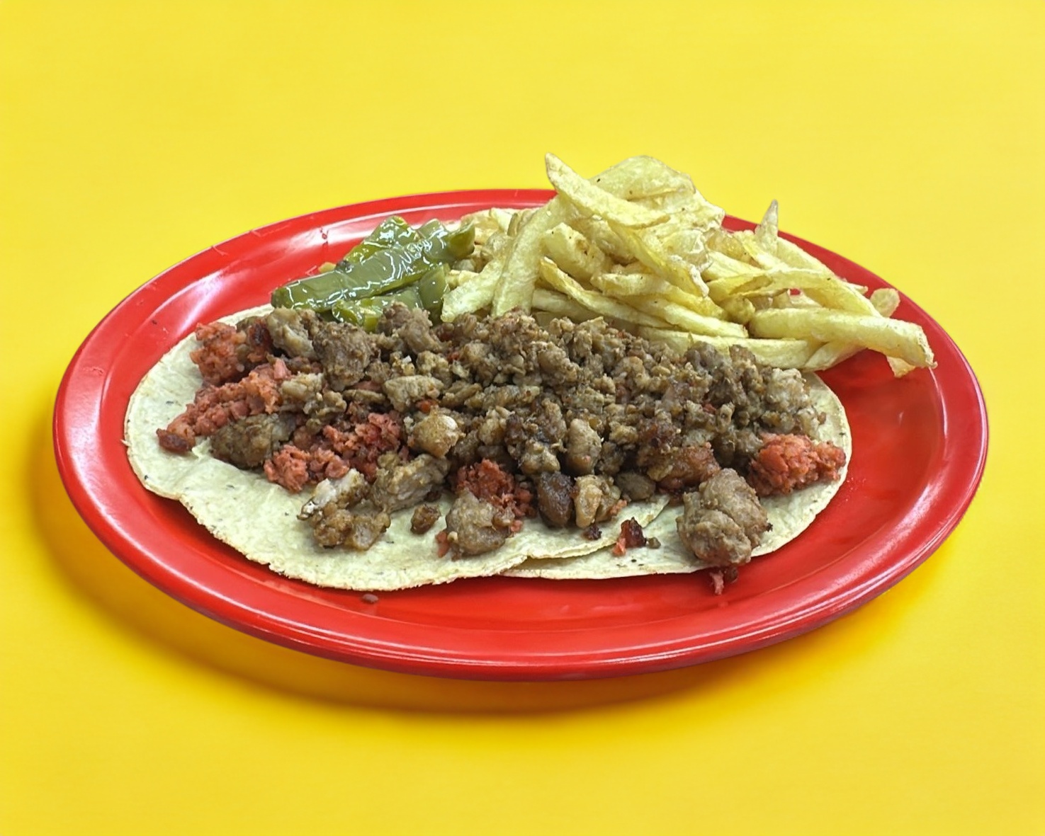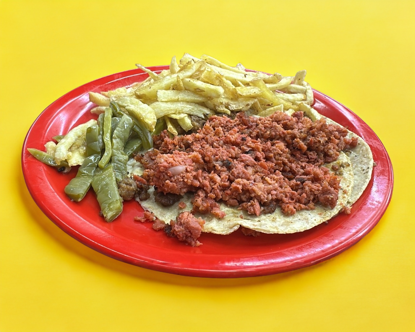 Tortilla doble de maíz, acompañada de frijol, nopal y papa a la francesa (80 g). El peso total del plato es de 170 g. Incluye verdura y salsa verde o roja.