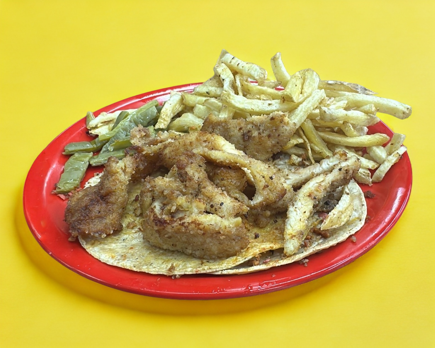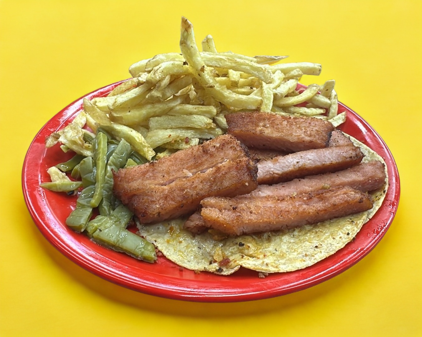 Platillo personal: Acompañado de frijol, nopal y papa a la francesa (80 g). Incluye verdura y salsa verde o roja.