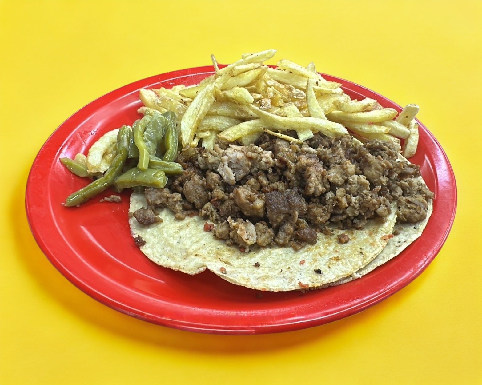 Platillo personal: Tortilla doble de maíz, acompañada de frijol, nopal y papa a la francesa (80 g). Peso total por taco: 170 g. 1 pieza (incluye verdura y salsa verde o roja).