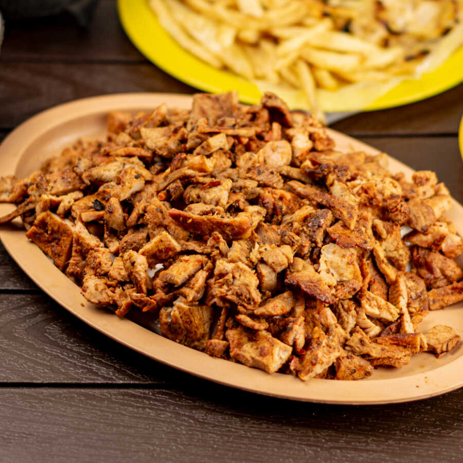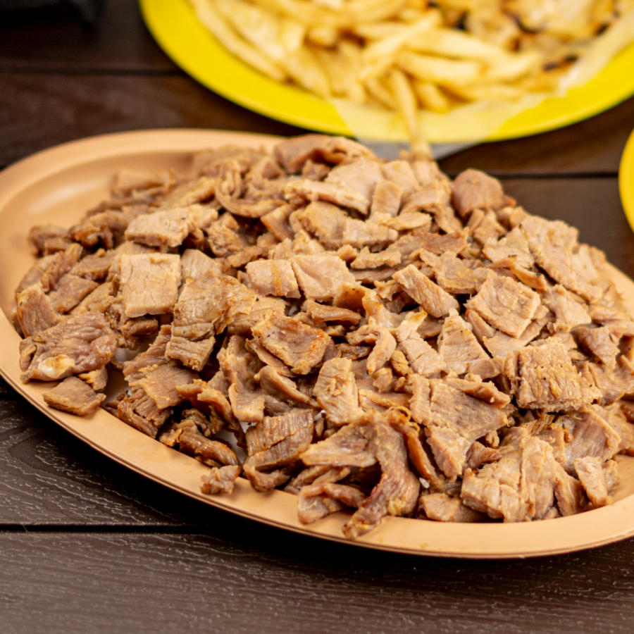 Carne Adobada de cerdo marinado en nuestra mezcla secreta de chiles rojos y especias. Papas cebollas y limones