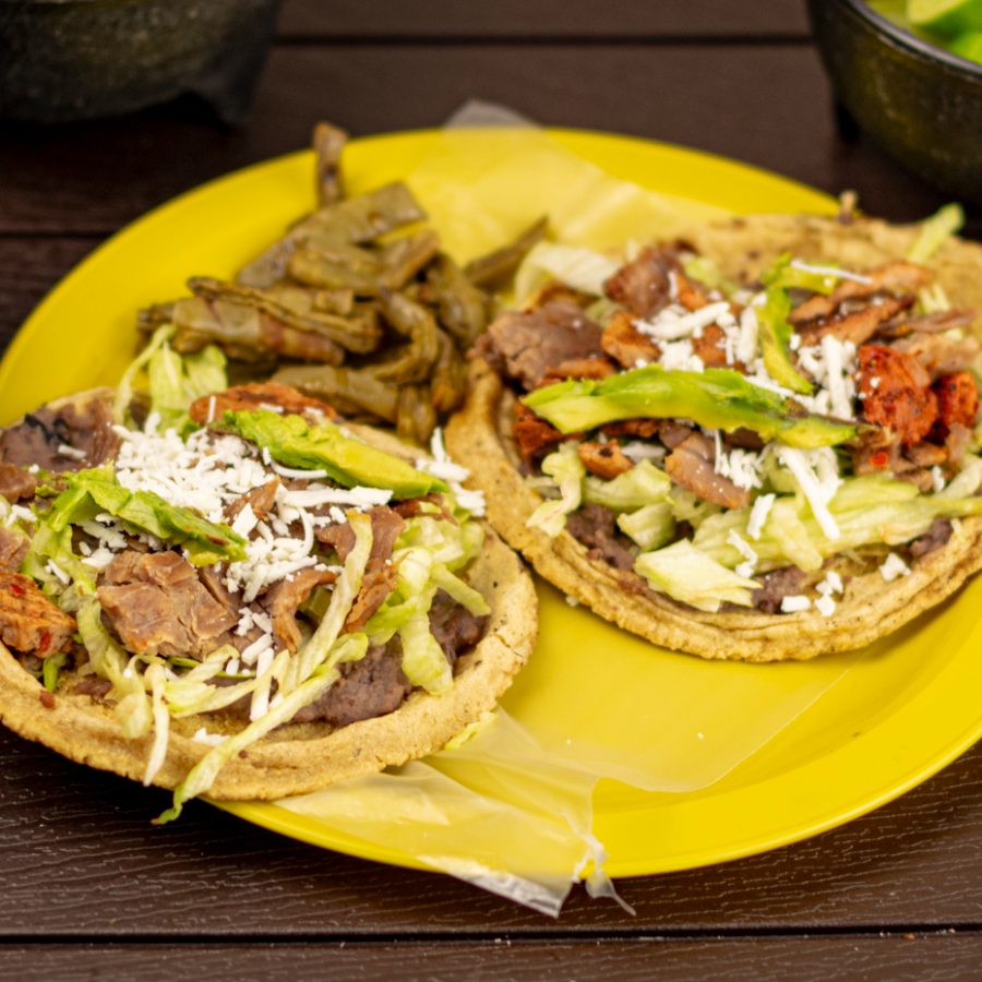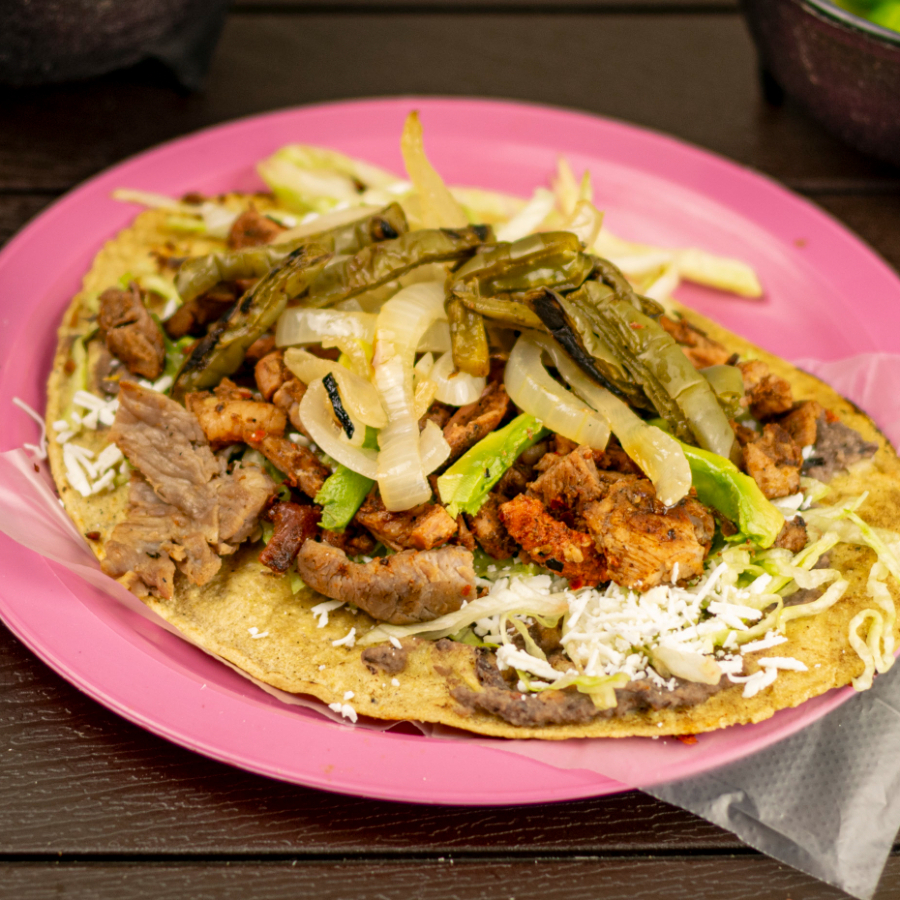 Base de maíz hecha a mano con frijolitos, la carne que elijas encima, cilantro, cebolla, crema y queso
