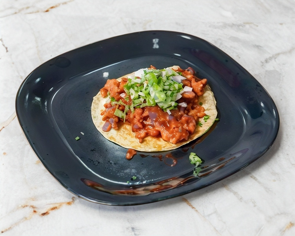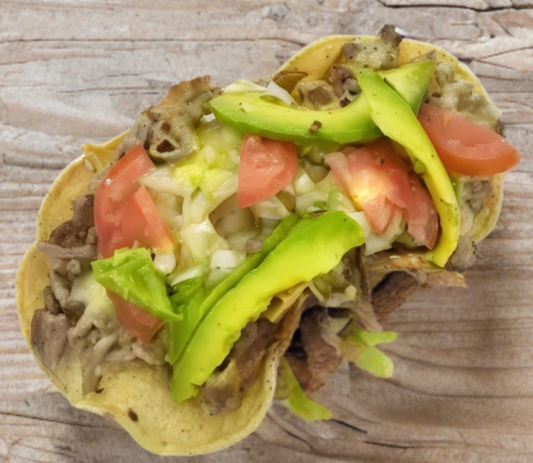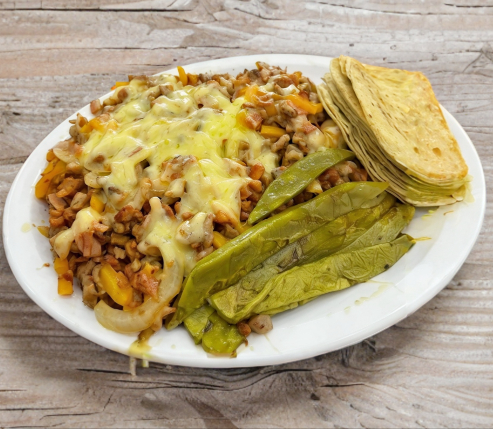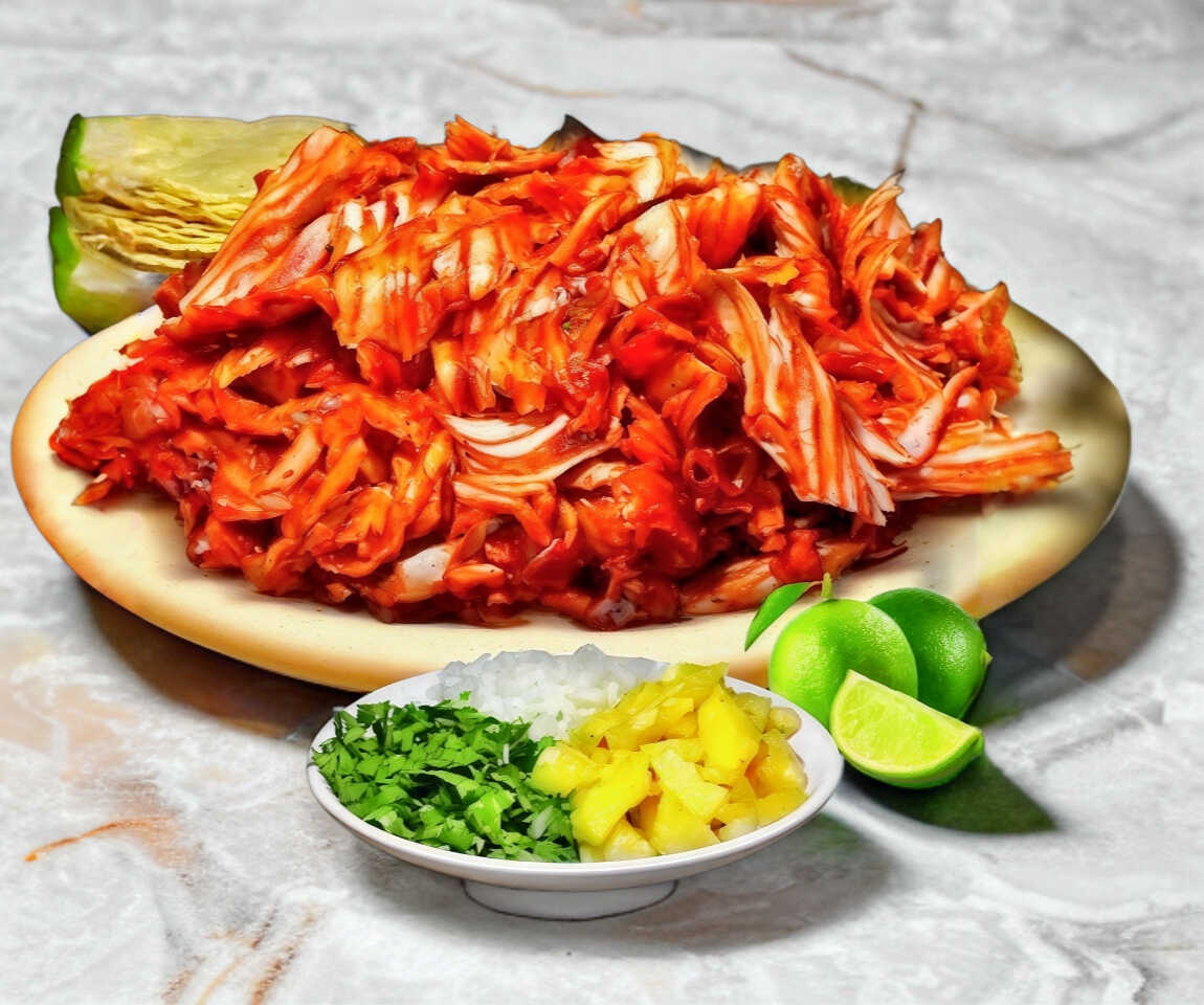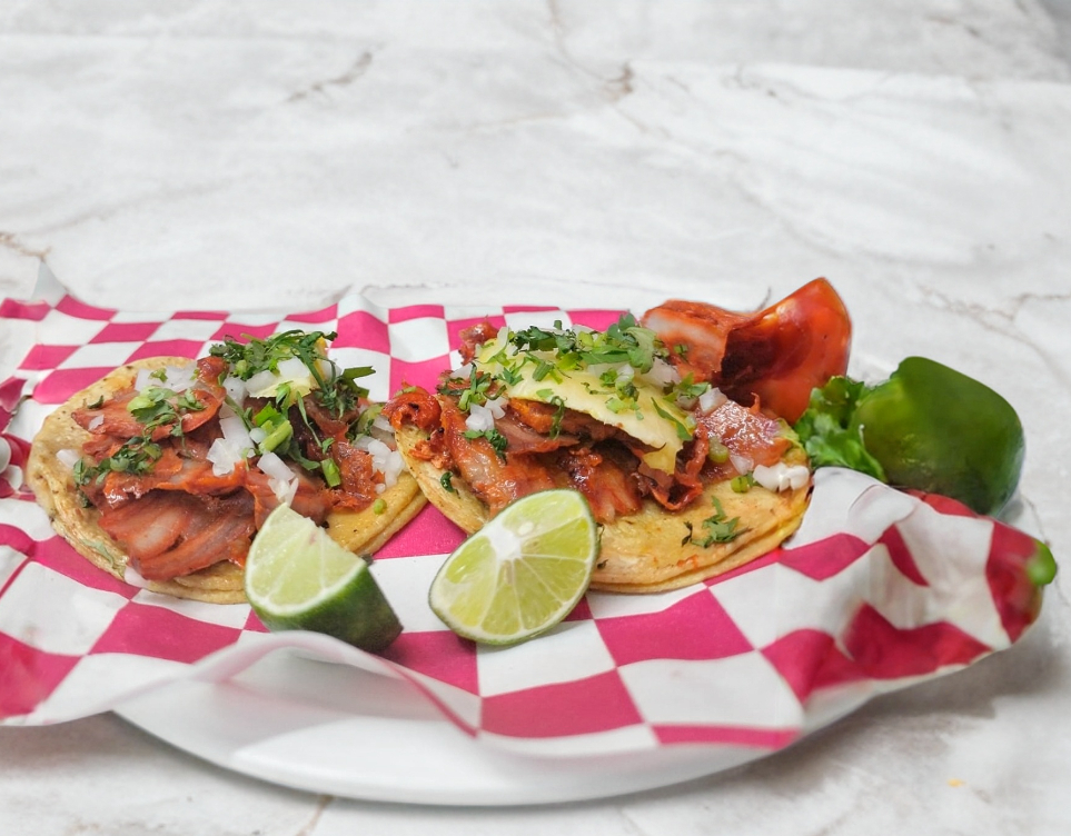 2 Tortillas, 32gr de carne de cerdo marinada, cebolla, cilantro, piña, limones y salsas