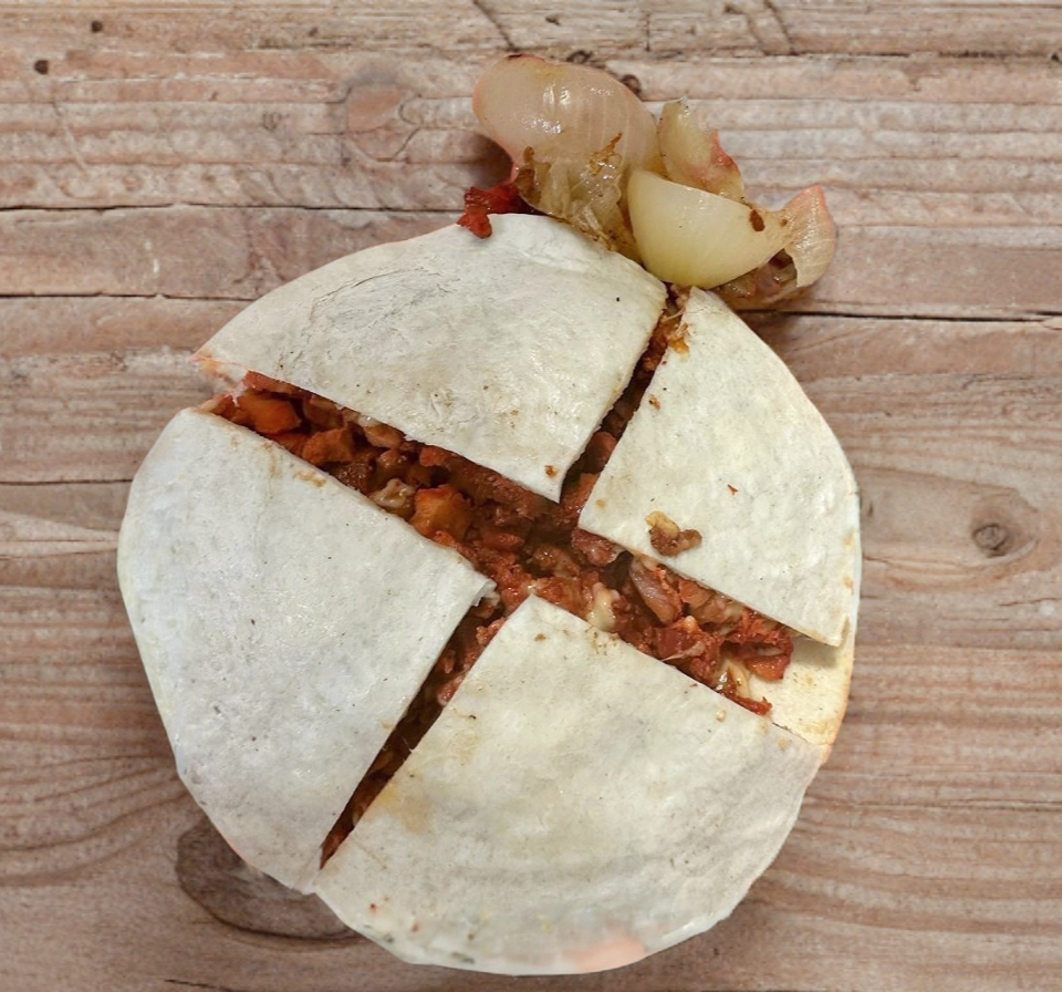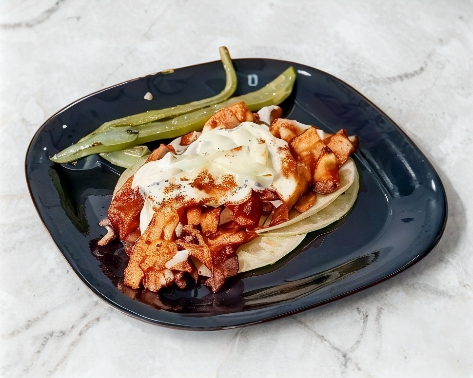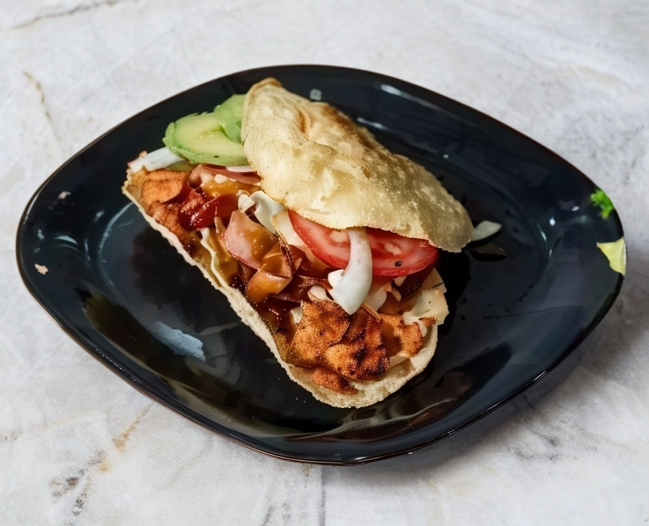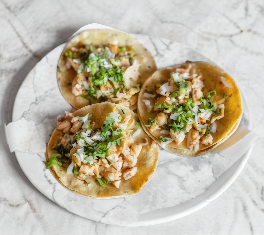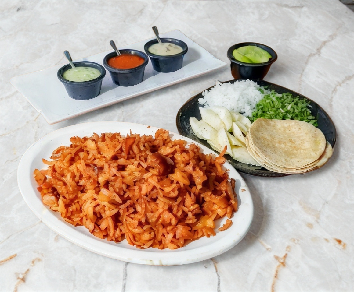 2 Tortillas, 32gr de carne de cerdo marinada, cebolla, cilantro, piña, limones y salsas