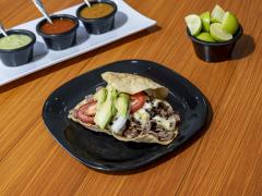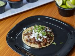 Un taco de bistec en tortilla de maíz, acompañado de nopales, limón y salsa