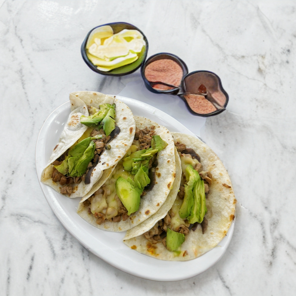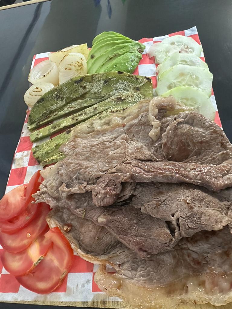 3 pzas de carne, aguacate, jitomate, cebollitas, nopales y chiles toreados.