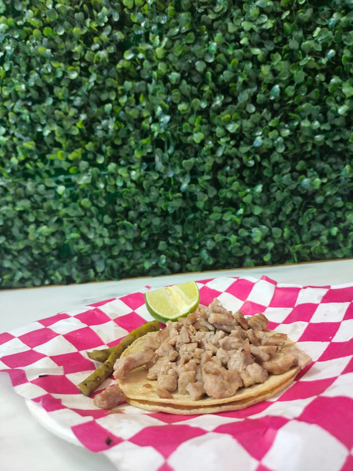 Un taco de chuleta en tortilla de maíz, acompañado de nopales, limón y salsa