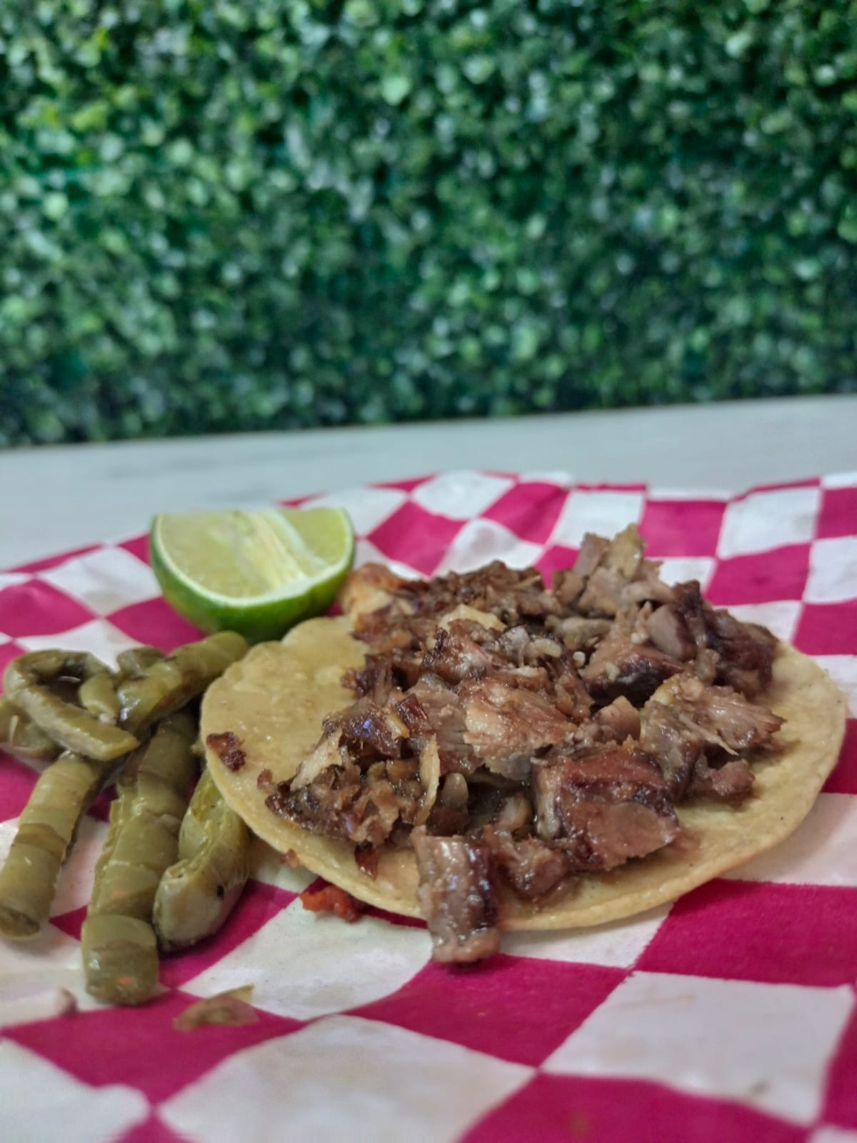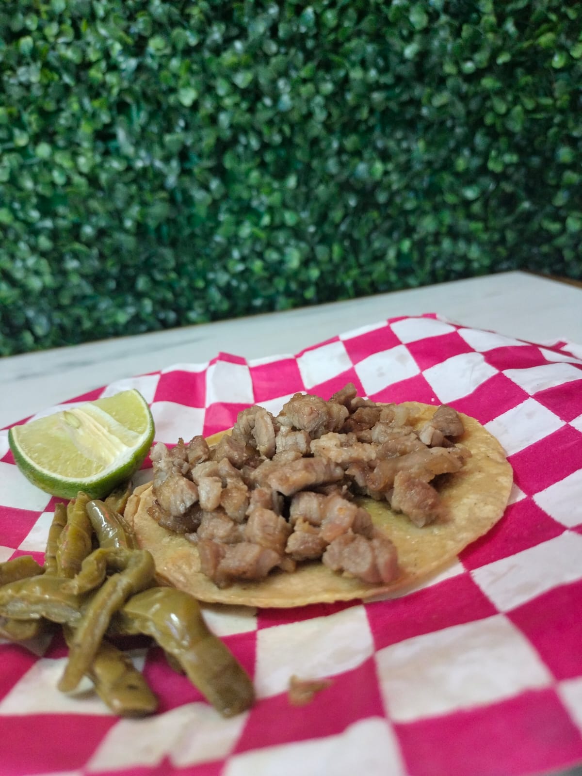 Un taco de bistec en tortilla de maíz, acompañado de nopales, limón y salsa