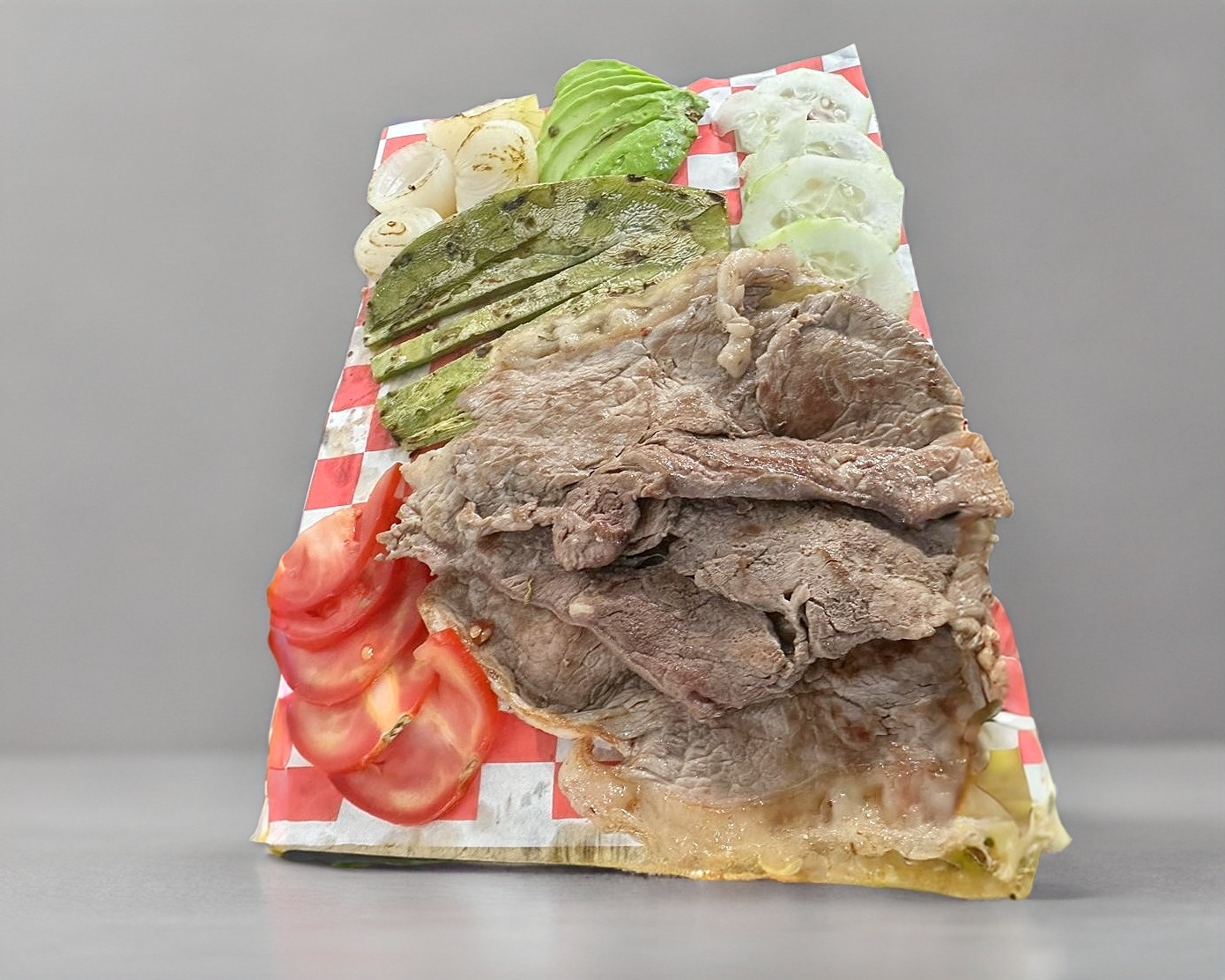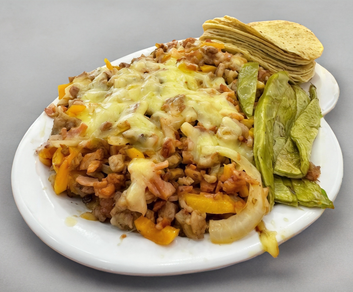 3 pzas de carne, aguacate, jitomate, cebollitas, nopales y chiles toreados.