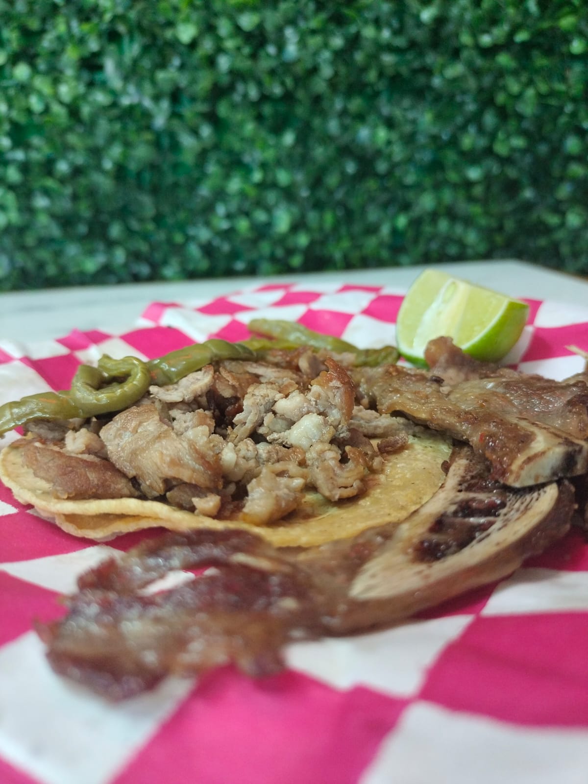 Un taco de costilla en tortilla de maíz, acompañado de nopales, limón y salsa