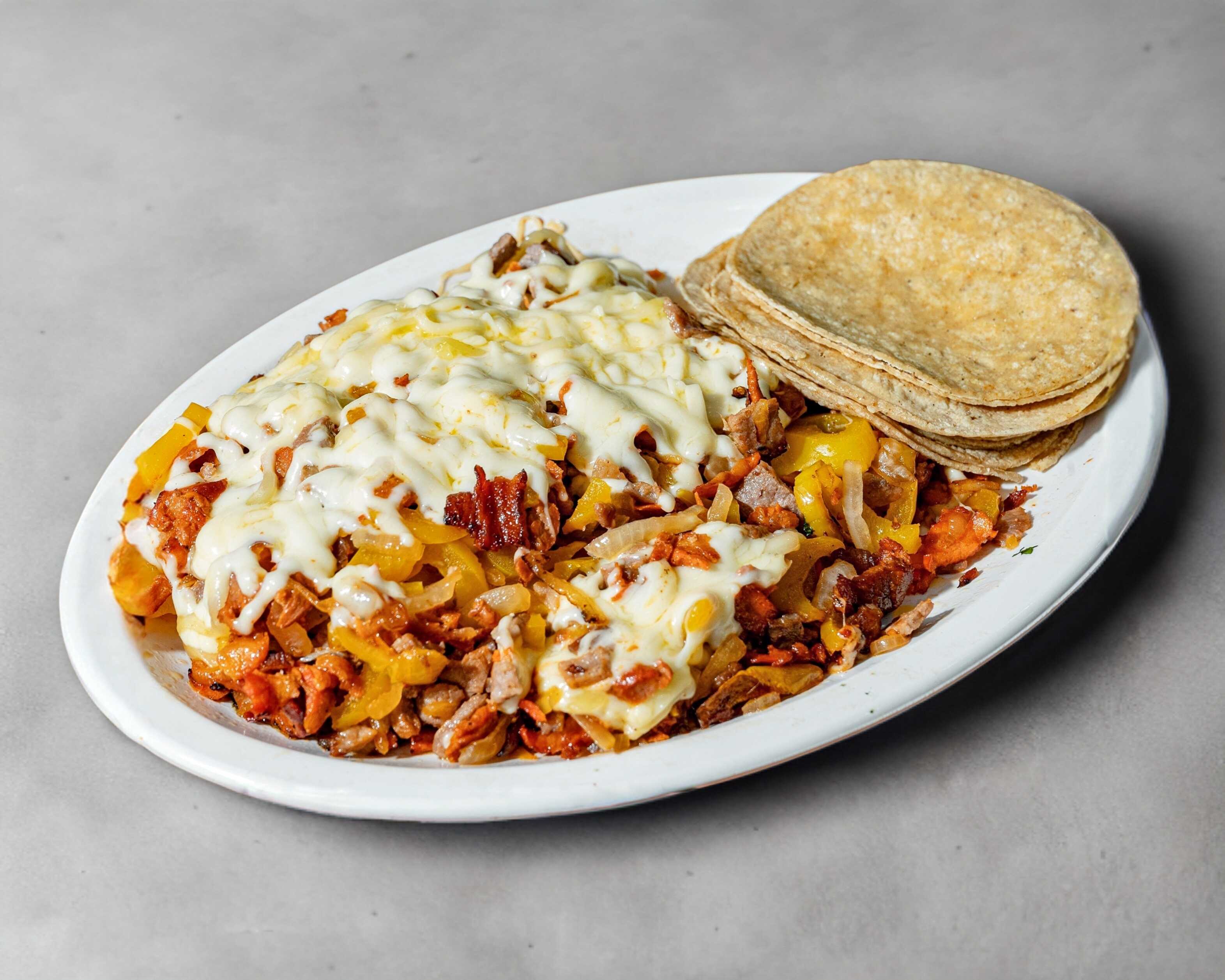 Porcion de arrachera con cebolla, morrón y queso