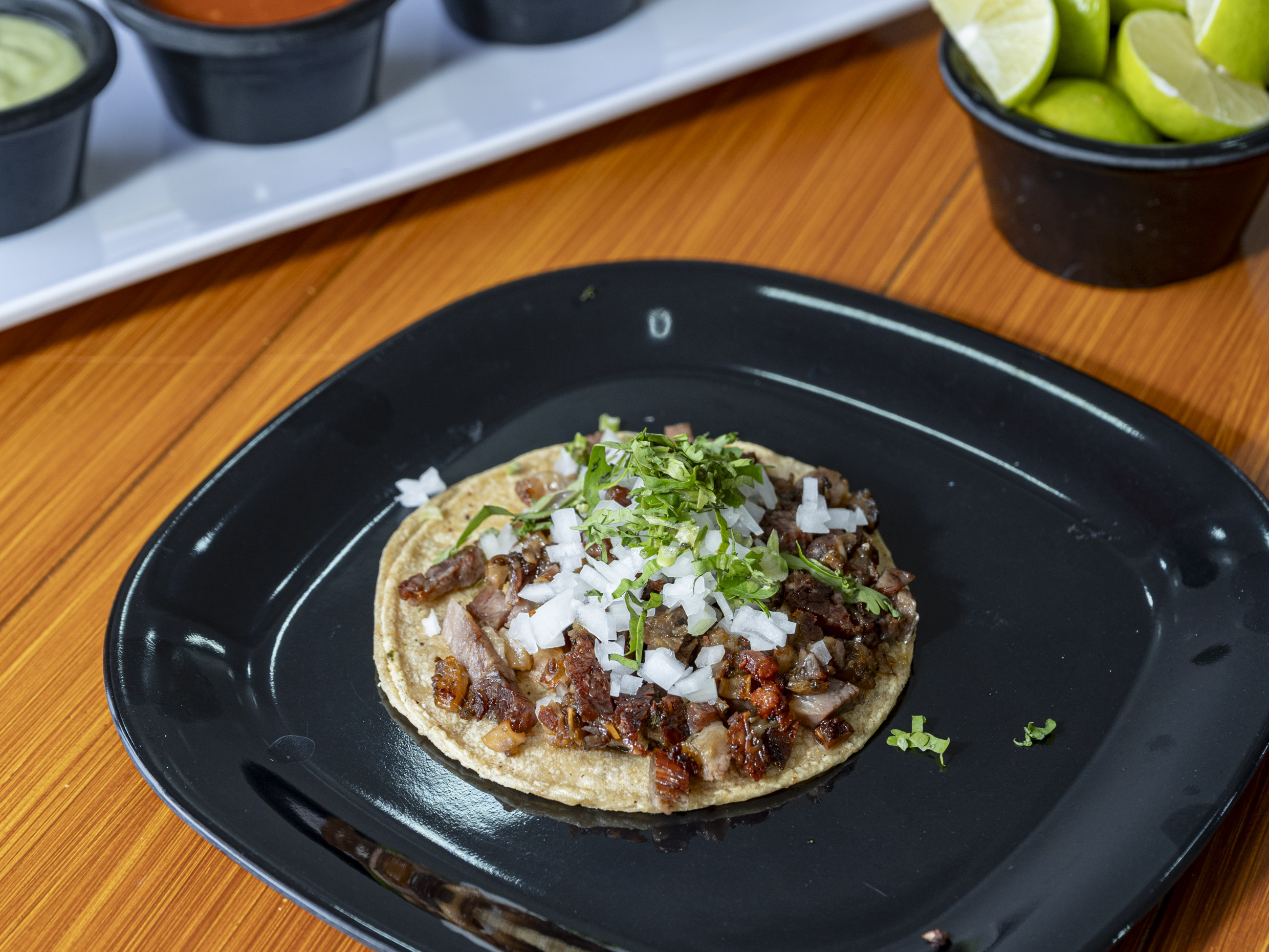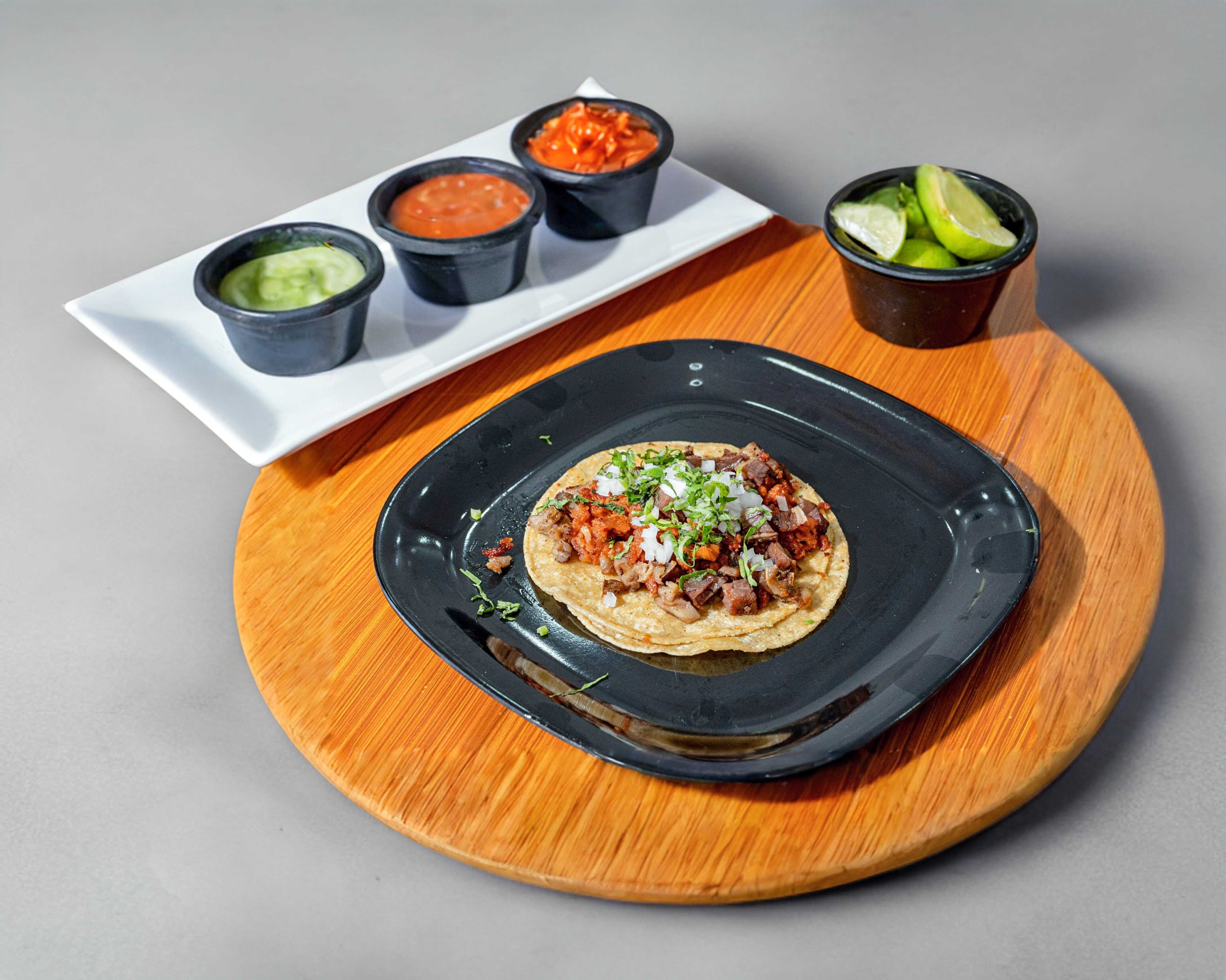 Un taco de costilla en tortilla de maíz acompañado de nopales, limón y salsa.