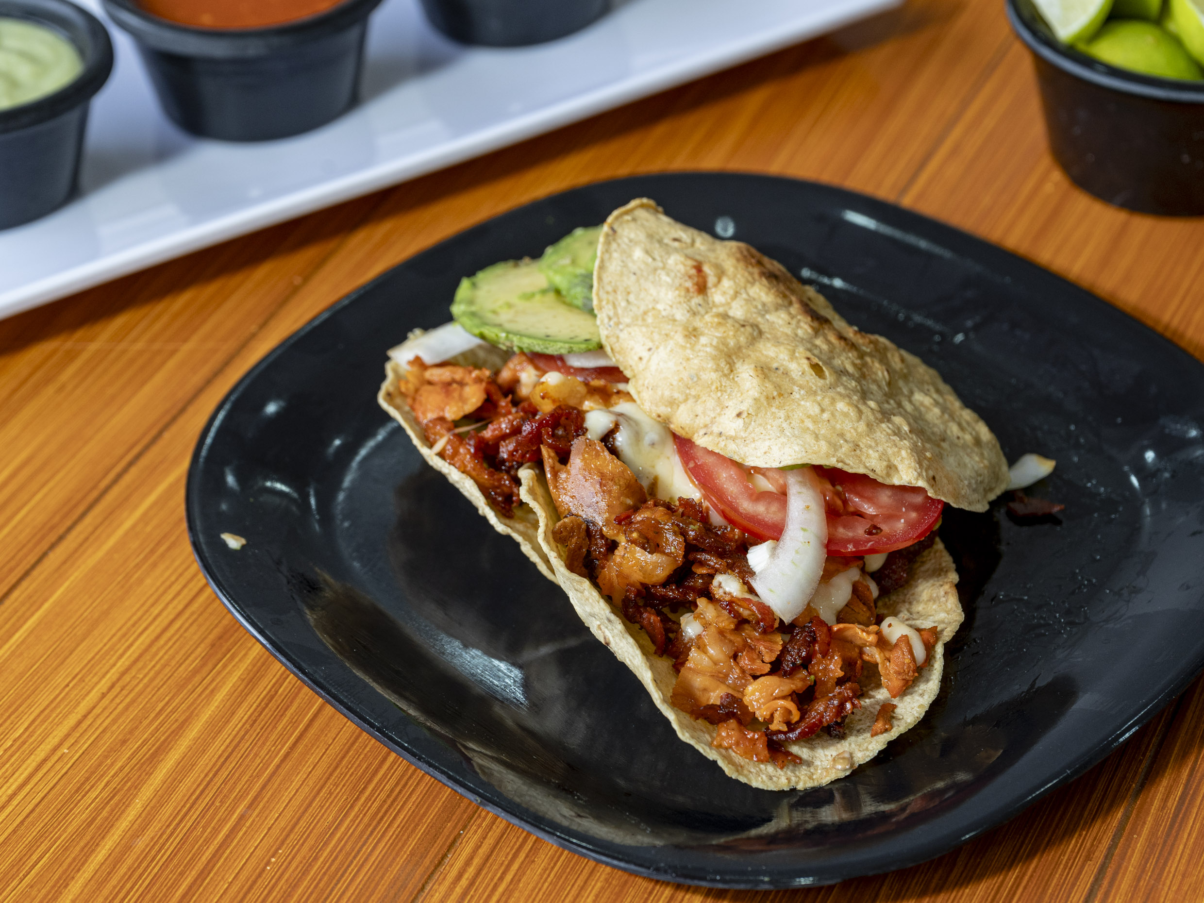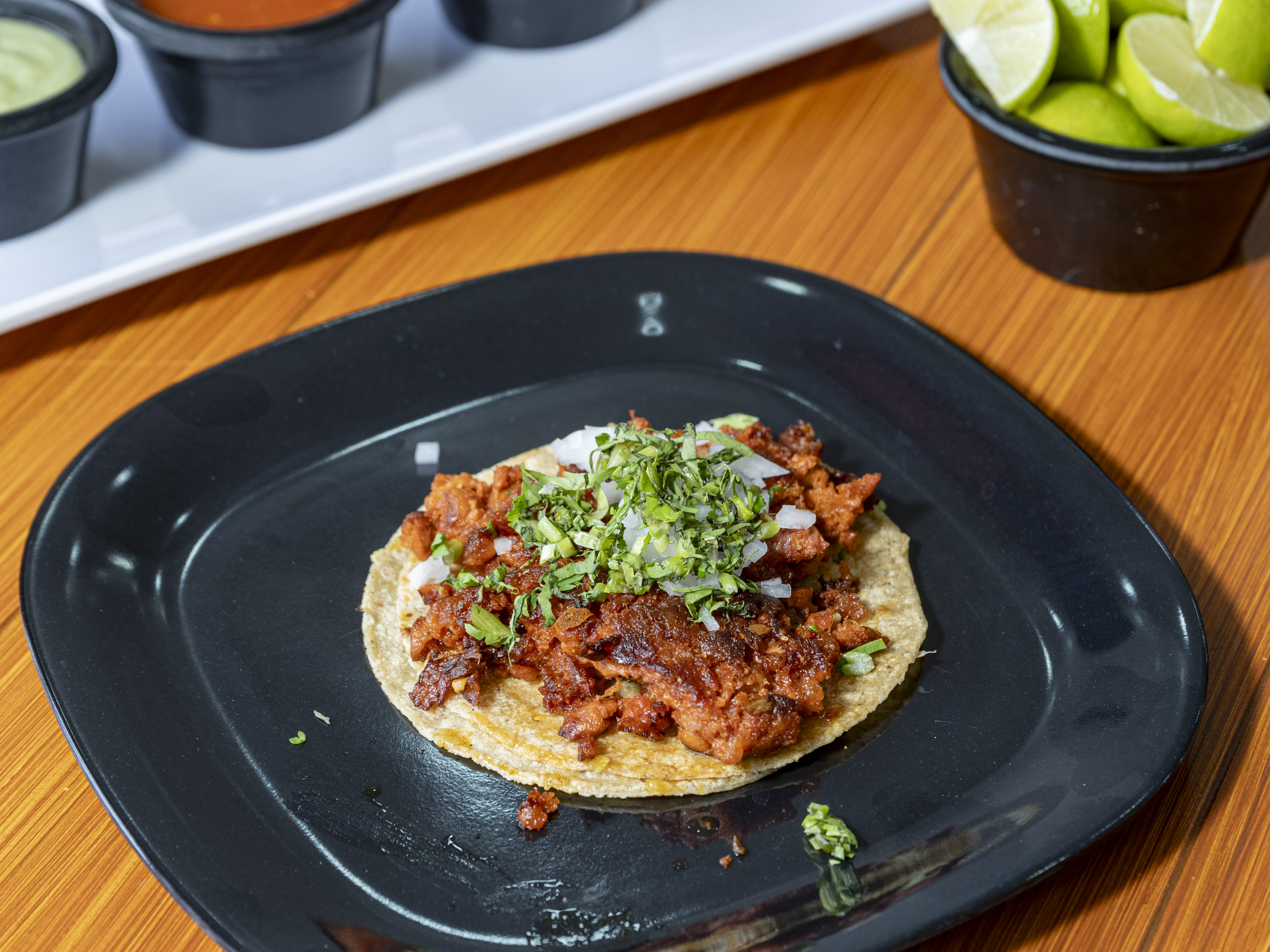 Un taco de chuleta en tortilla de maíz acompañado de nopales, limón y salsa.