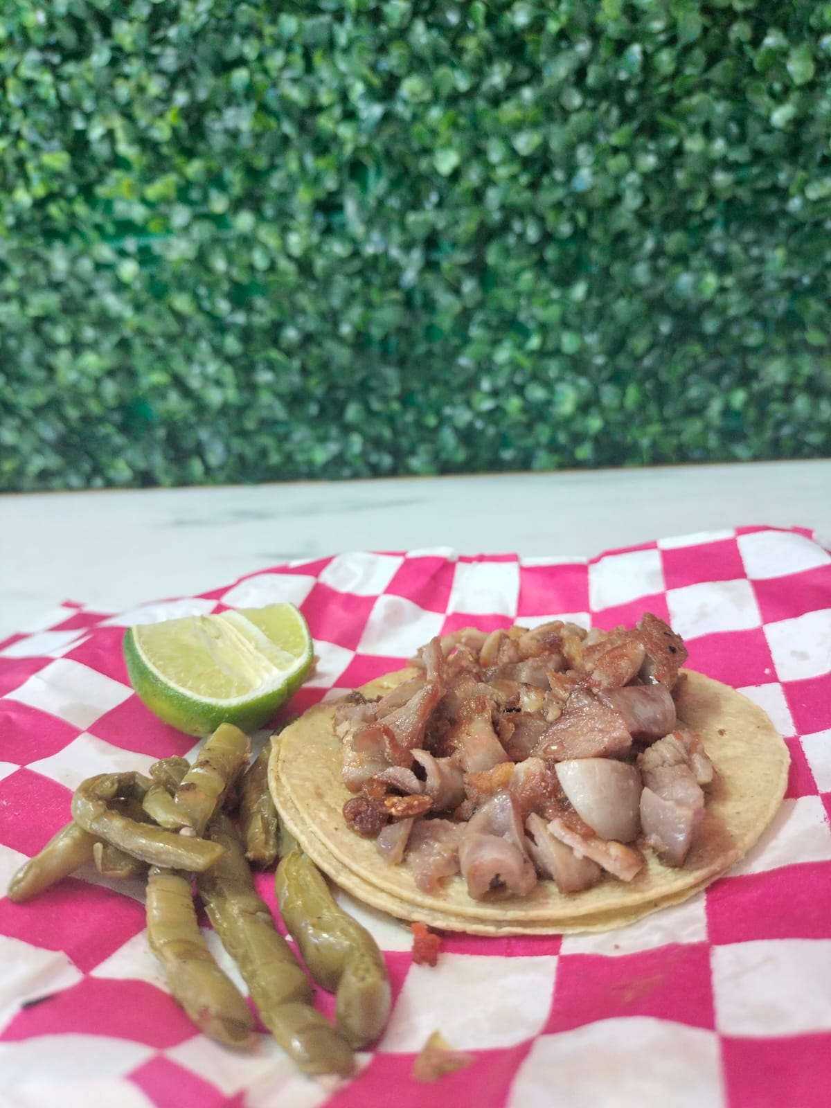 Un taco de tripa en tortilla de maíz acompañado de nopales, limón y salsa.