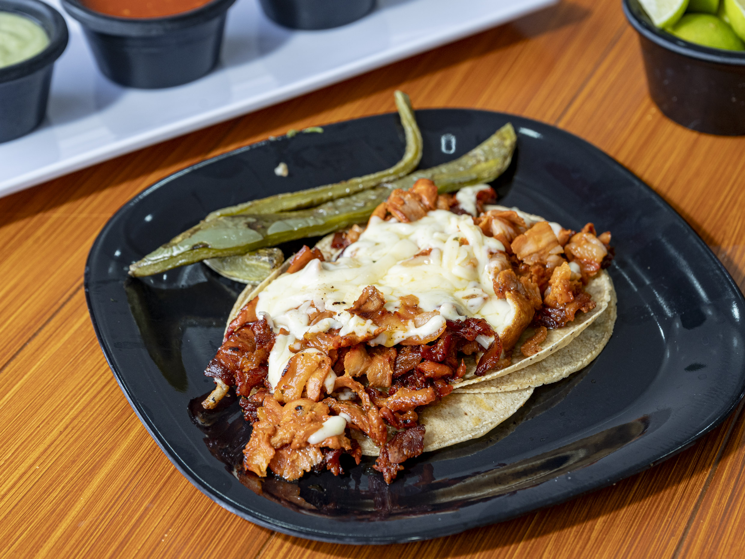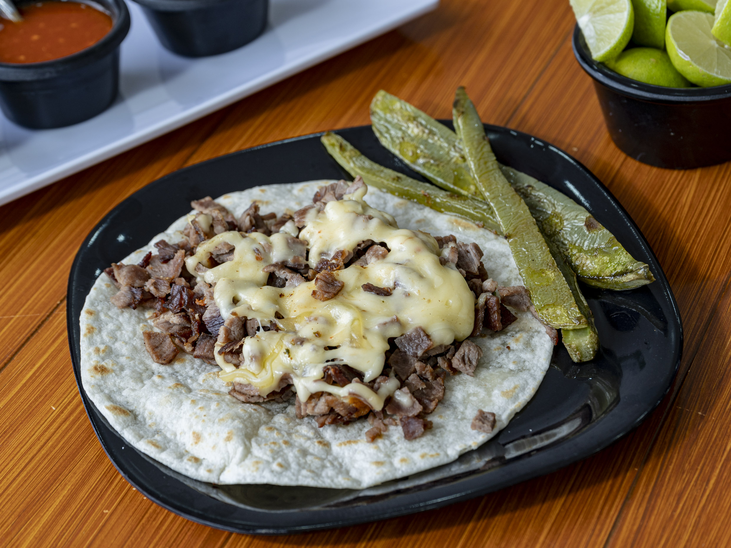 Un taco de suadero en tortilla de maíz acompañado de nopales, limón y salsa.