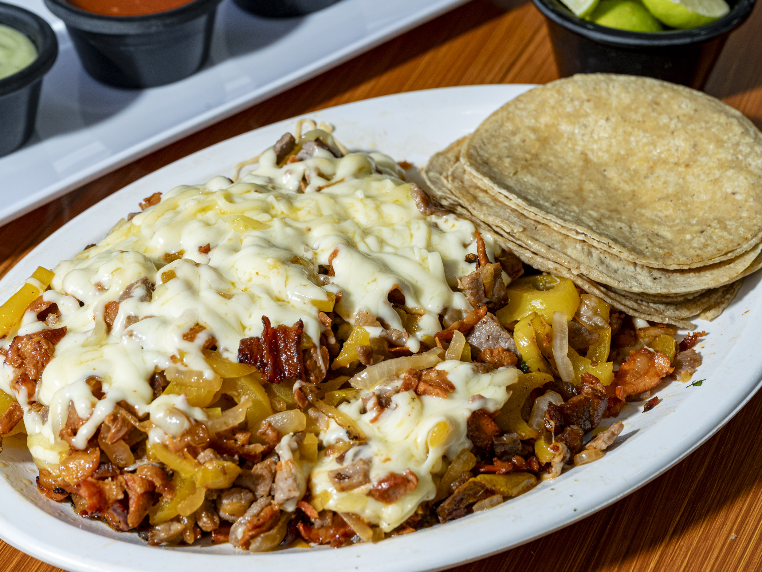 Porcion de arrachera con cebolla, morrón y queso