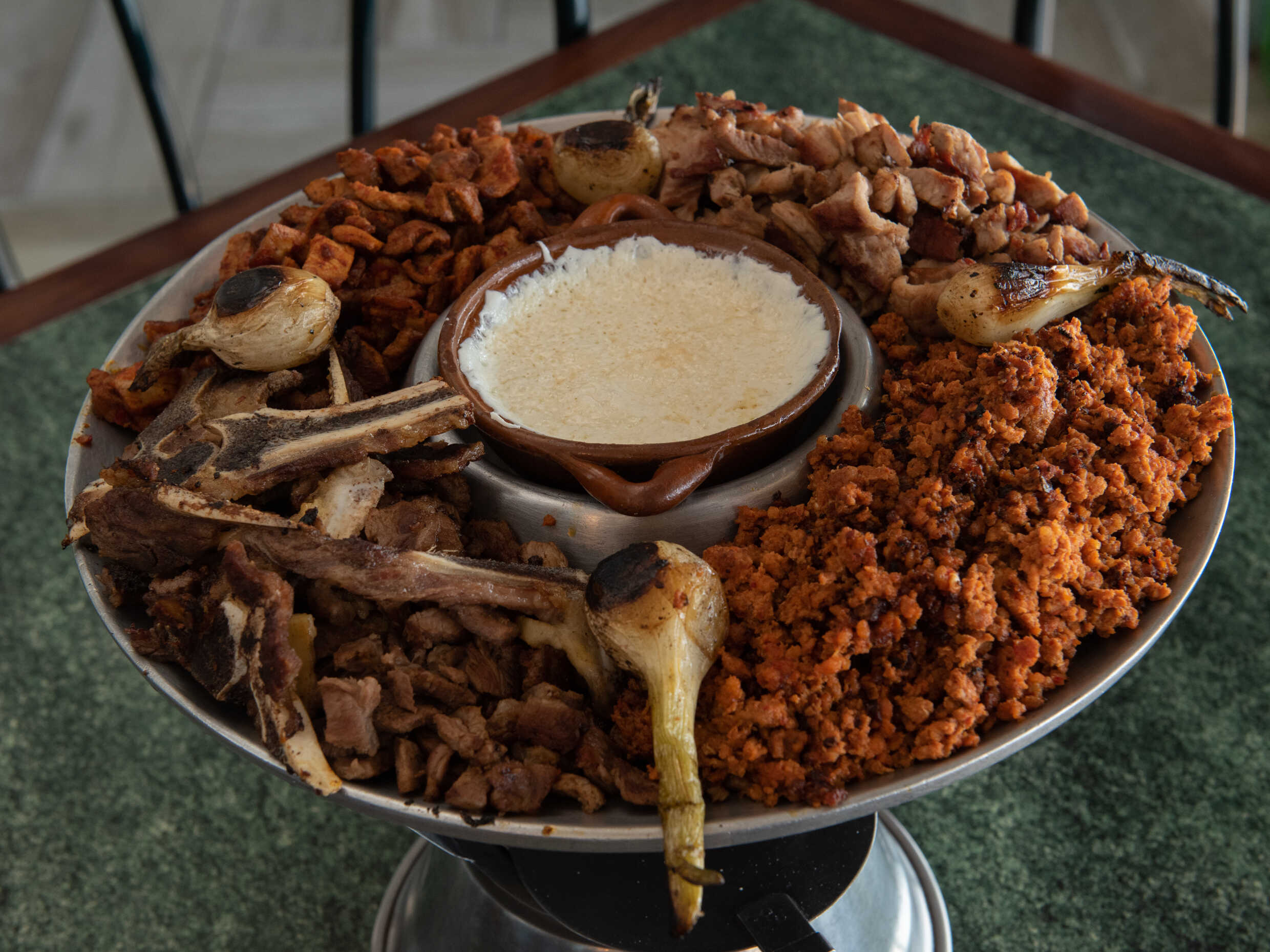 1,000 g. de carne peso en crudo puedes combinar hasta dos carnes. Acompañado de Saksa, limones, tortillas a mano. Regala complemento.