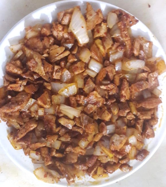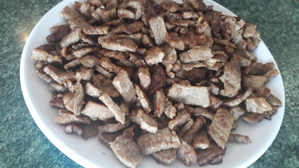 500 g. de morrón, cebolla, tocino y carne pesado en crudo, picada para hacerse tacos