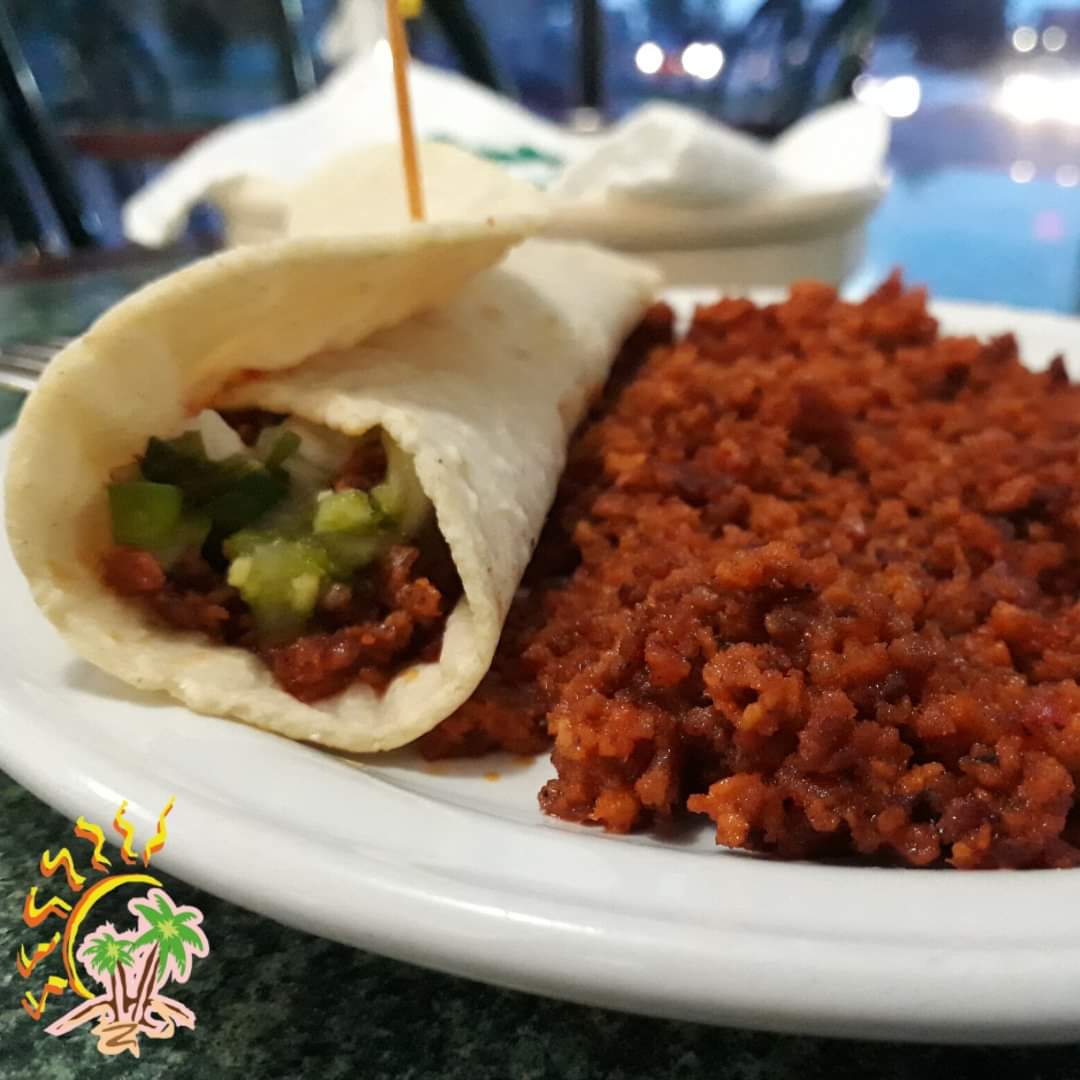 250 g de carne (chorizo, chuleta y bistec con salsa roja) peso en crudo, picada para hacer tacos
