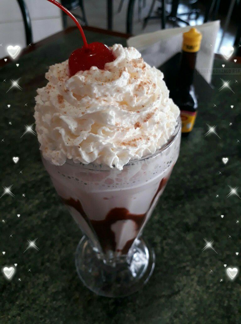 Helado, crema batida, cereza, canela, chocolate derretido.