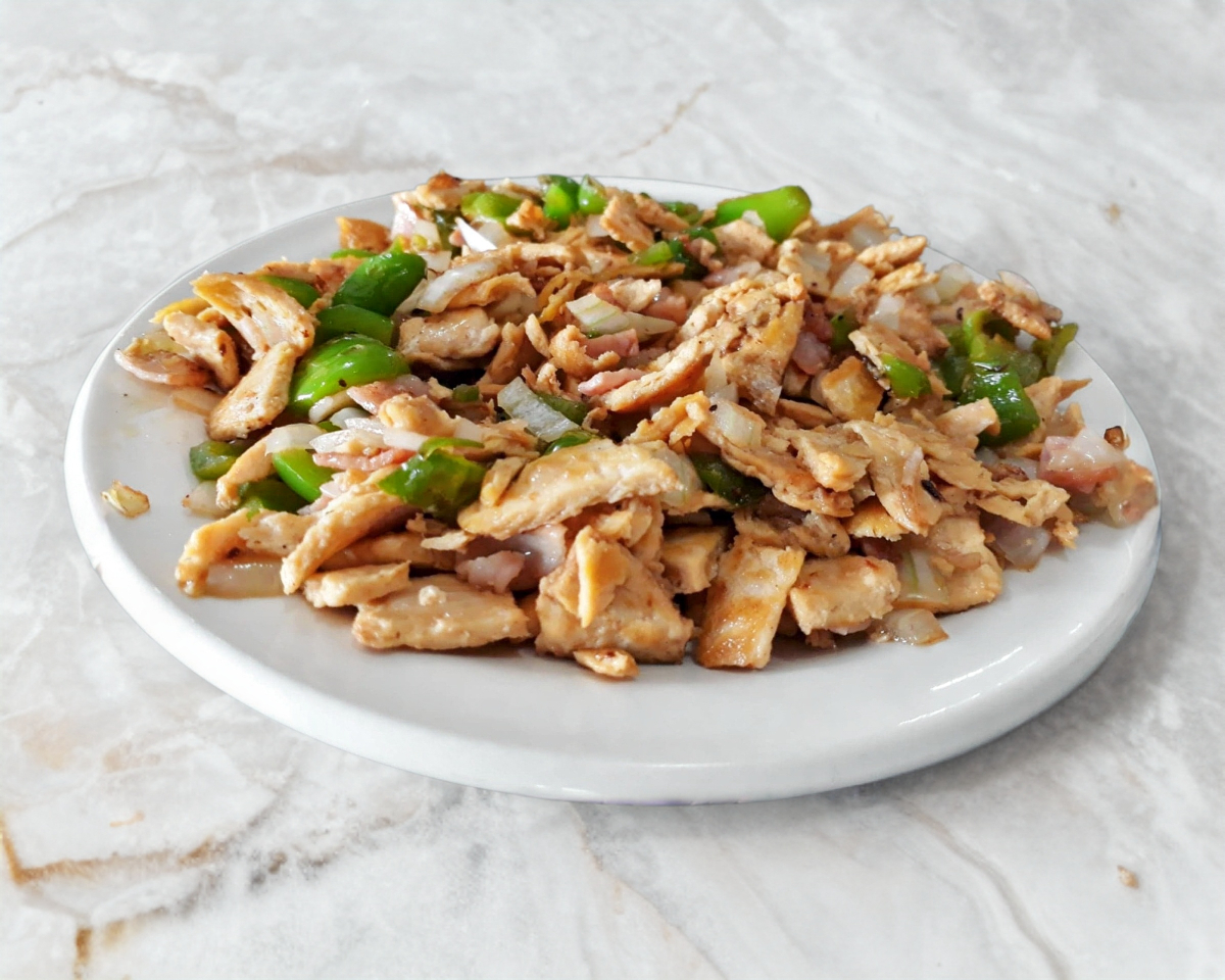 1,000 g. de morrón, cebolla, tocino y carne de pollo, peso en crudo