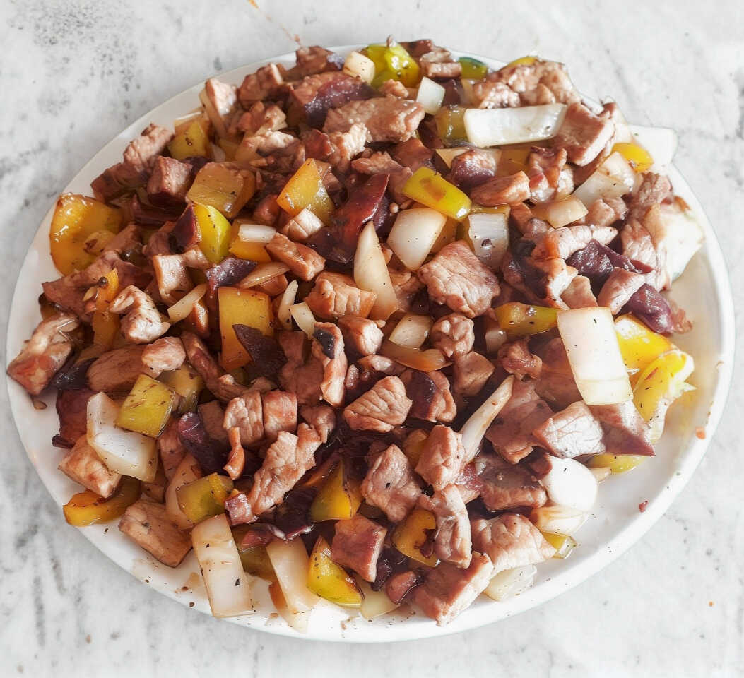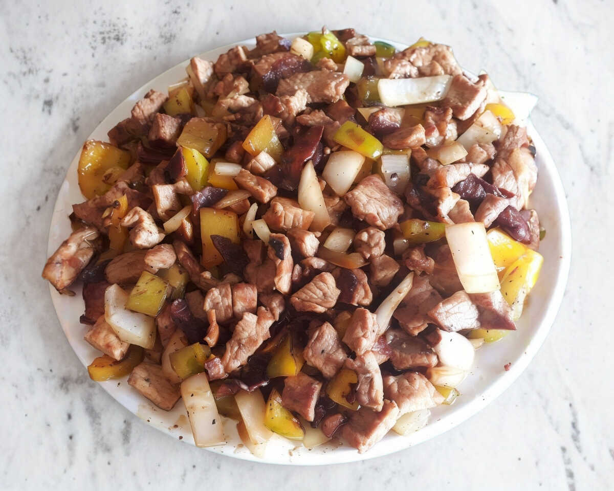 1,000 g. de morrón, cebolla, tocino y carne, peso en crudo