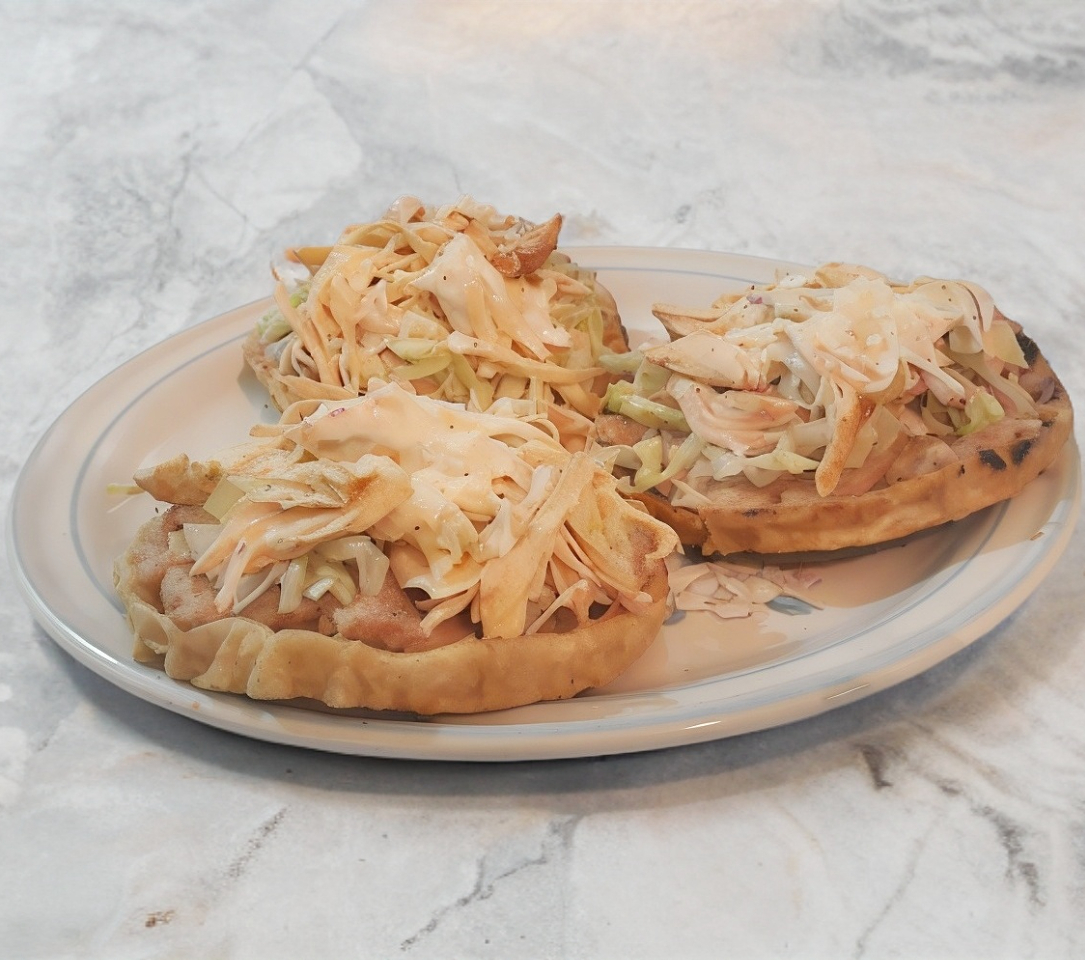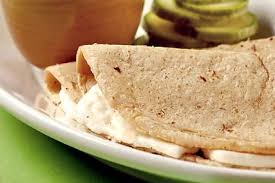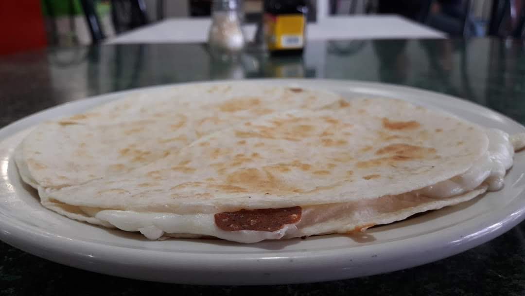 Tortilla de harina, queso Oaxaca, jamón, queso amarillo.