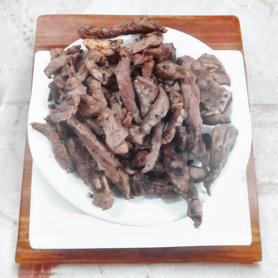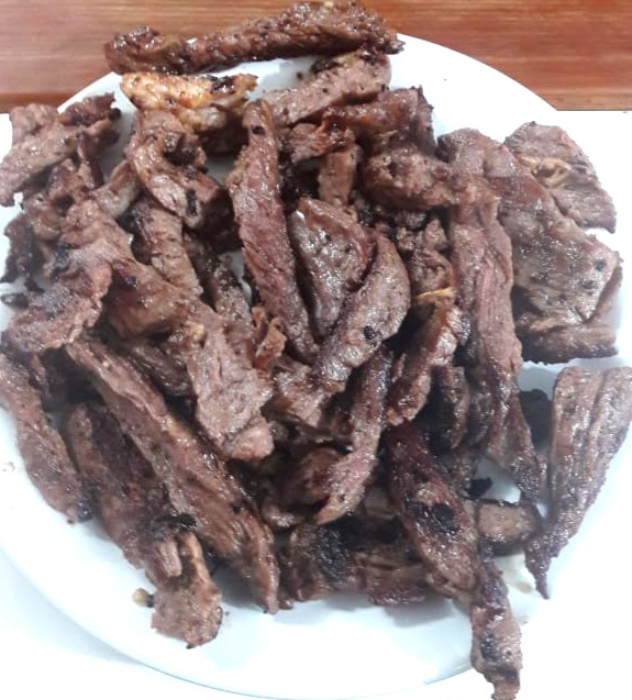 500 g. peso en crudo flameados con tequila, con jitomate, cebolla, morrón y tocino.