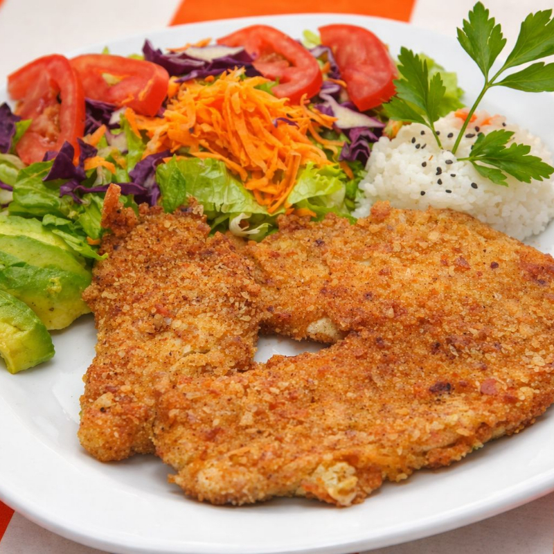 Filete de pescado empanizado acompañado de ensalda (lechuga,zanahoria,jitomate y repollo) con una porcion de arroz y pan para acompañar