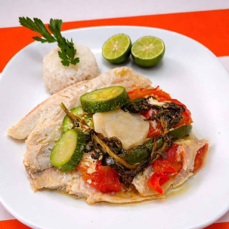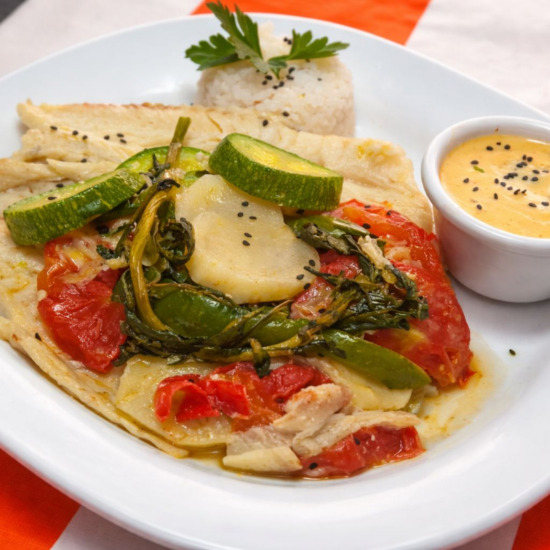 Filete de pescado empapelado acompañado con calabaza, jitomate, zanahoria, epazote, queso gratinado, dip de chipotle y una porcion de arroz